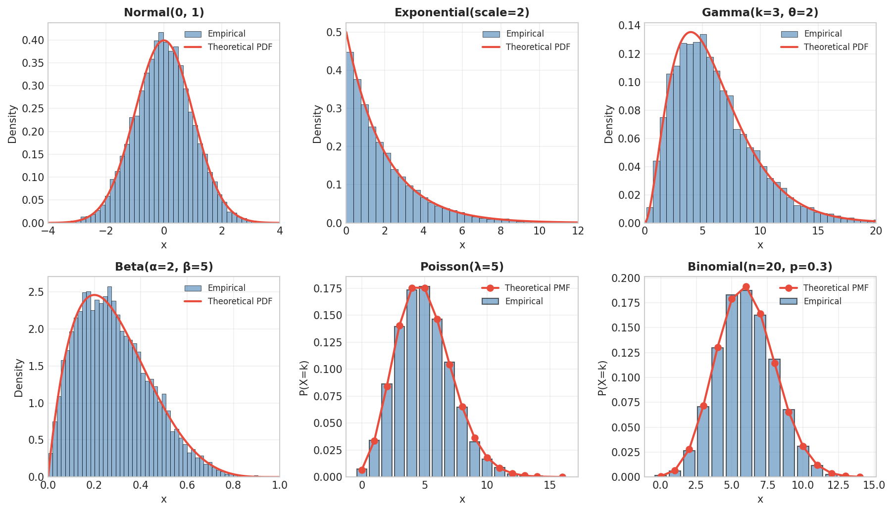 Know your parameterizations: Rate vs scale causes endless bugs. Always verify sample means match expectations.