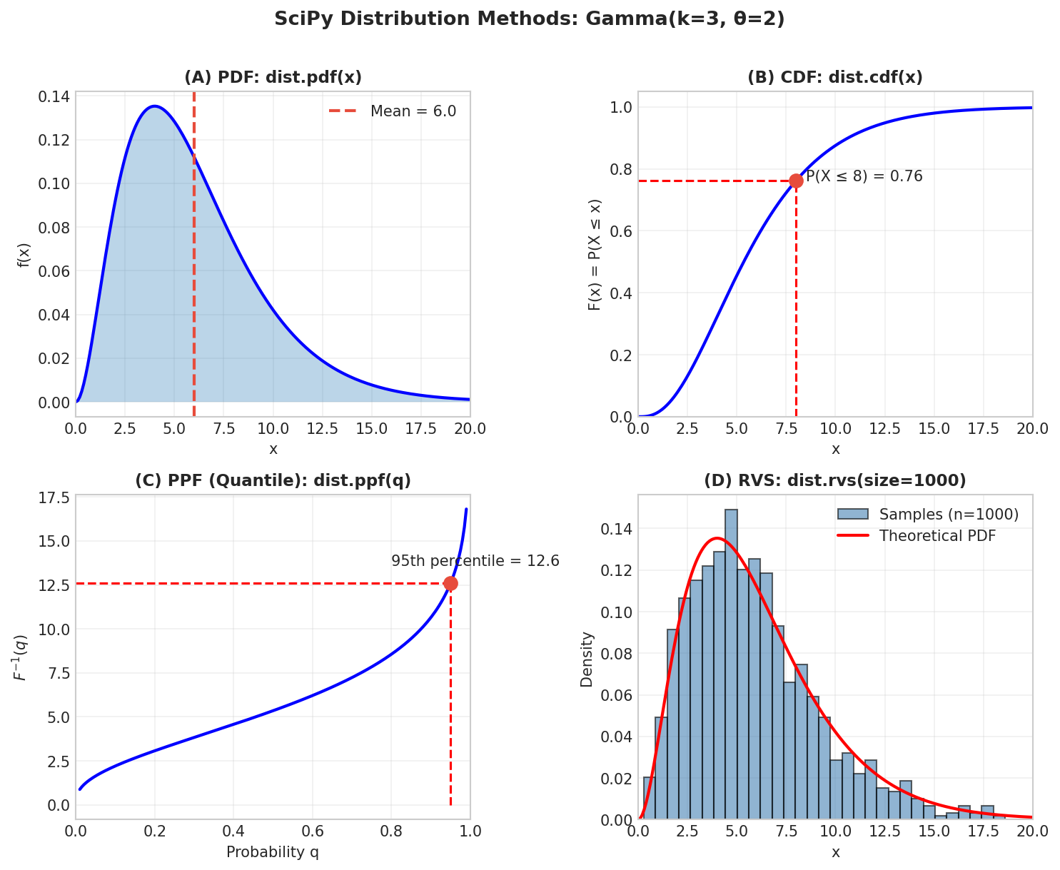 100+ distributions; PDF/CDF/PPF/fitting; statistical tests |