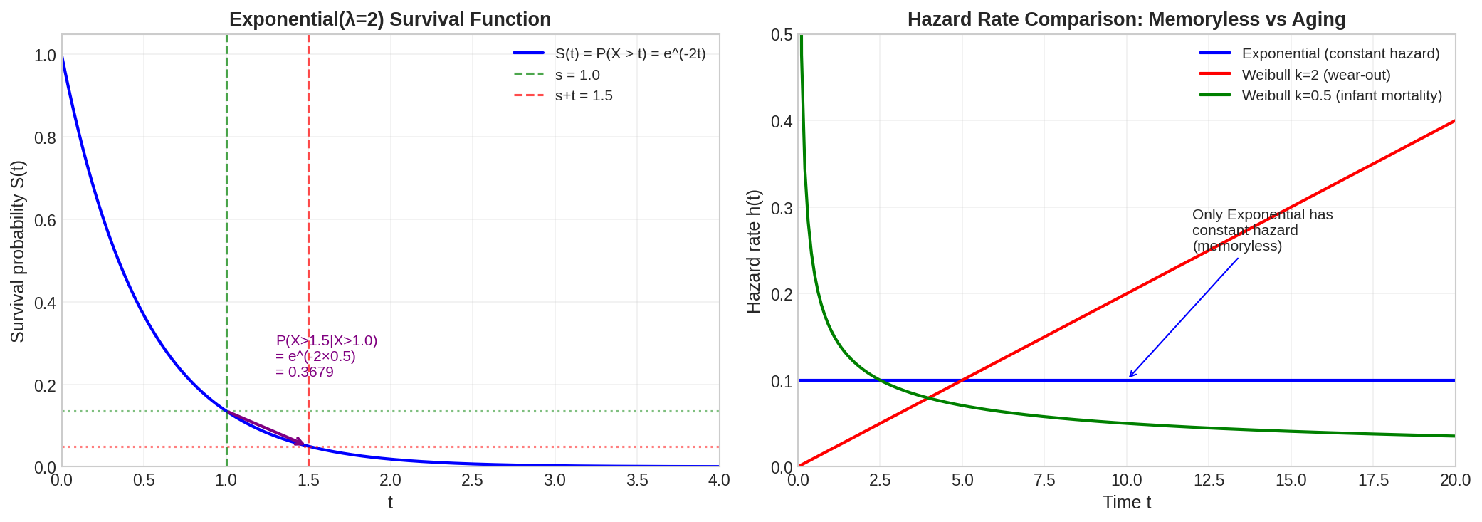 Key modeling insight: Use Exponential only when you believe the hazard rate is truly constant—typically for “random shocks” rather than aging processes.