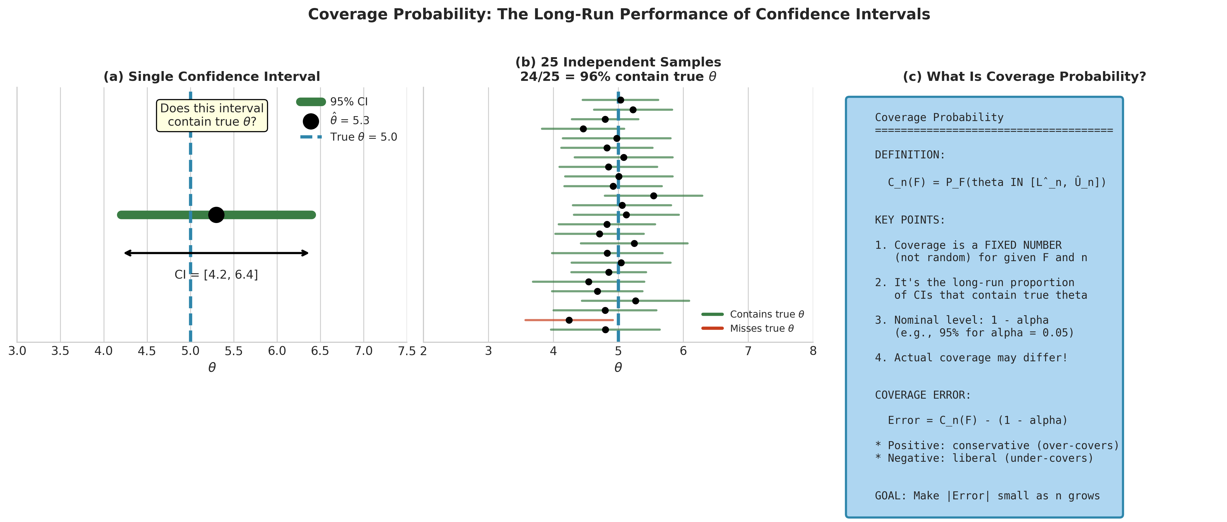 Fig. 175 Figure 4.7.1: Coverage probability visualized. (a) A single confidence interval either contains (✓) or misses (✗) the true parameter—we cannot know which from the data alone. (b) Over many repetitions from the same population, the coverage probability is the long-run proportion of intervals that contain the truth. (c) The formal definition: coverage is the probability that the random interval captures the fixed but unknown parameter.