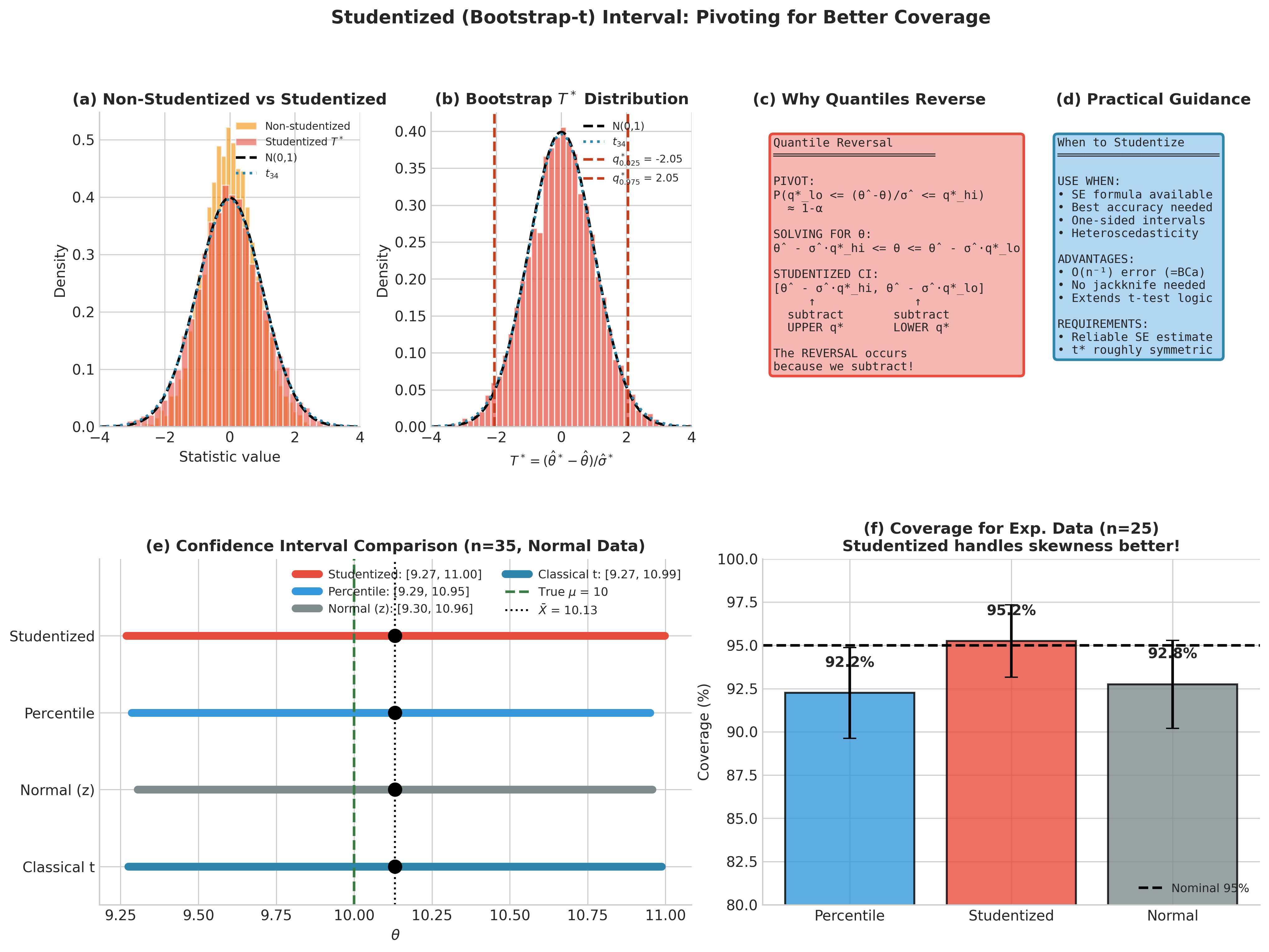 Fig. 177 Figure 4.7.3: The studentized (bootstrap-t) method. (a) Comparison of non-studentized vs studentized bootstrap statistics—studentization produces a distribution closer to the reference \(t\) distribution. (b) The bootstrap \(T^*\) distribution with quantiles used for interval construction. (c-d) Explanation of quantile reversal and practical guidance. (e) Confidence interval comparison across methods for normal data. (f) Coverage simulation on exponential data demonstrating studentized method’s advantage for skewed distributions.