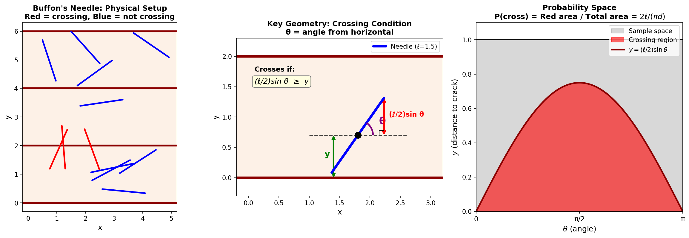 Fig. 31 Buffon’s Needle Geometry. Left: The physical setup with needles scattered across parallel planks (red = crossing, blue = not crossing). Middle: The key geometry—a needle crosses if its center’s distance \(y\) to the nearest crack is less than the vertical projection \((\ell/2)\sin\theta\). Right: The probability space showing the crossing region; the probability equals the ratio of areas: \(2\ell/(\pi d)\).