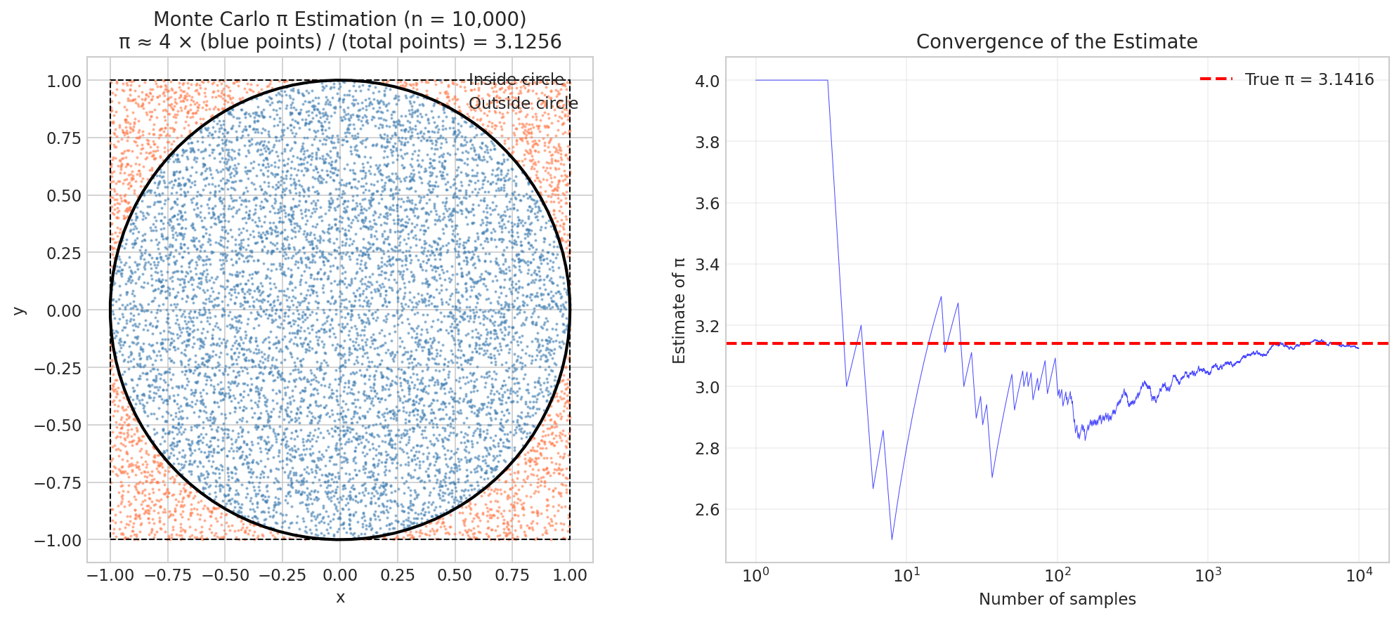 Fig. 32 Monte Carlo π Estimation. Left: Blue points fall inside the unit circle; coral points fall outside. The ratio of blue to total points estimates \(\pi/4\). Right: The running estimate stabilizes as samples accumulate—the characteristic “noisy convergence” of Monte Carlo.
