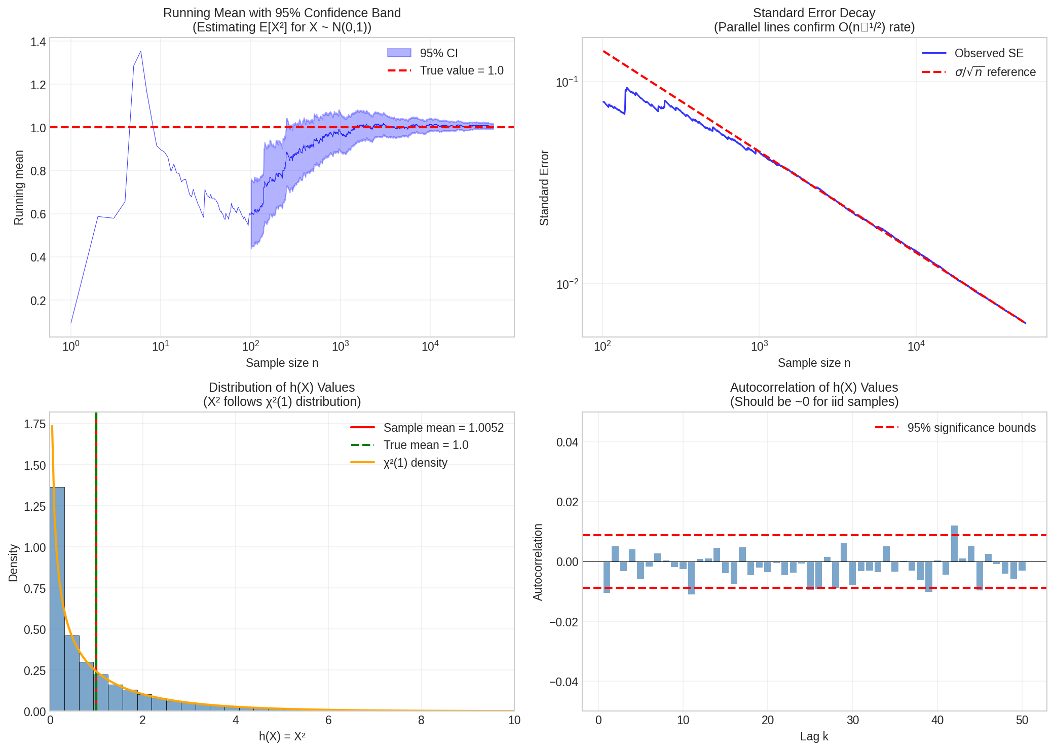 Practical application: Always report standard errors and confidence intervals. Use pilot studies to estimate variance for sample size planning. Be explicit about whether you’re targeting SE or CI half-width. Monitor convergence visually with running mean plots and standard error decay.