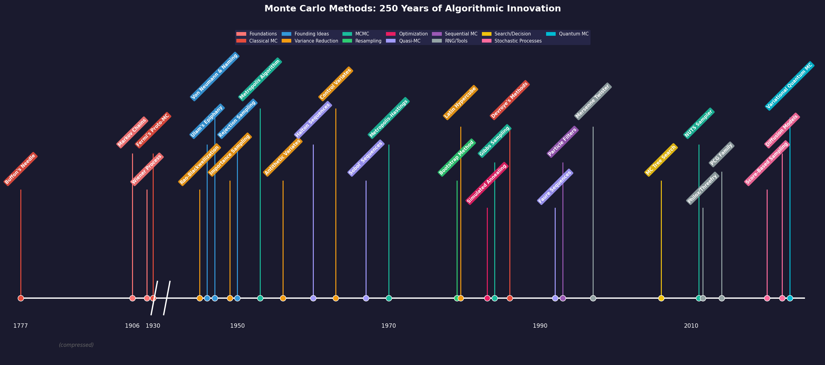 Fig. 30 Historical Evolution of Monte Carlo Methods. This timeline traces 250 years of algorithmic innovation, from Buffon’s needle experiment in 1777 through the founding contributions of Ulam and von Neumann in the 1940s, the development of MCMC methods, resampling techniques, and modern neural-enhanced approaches. Each innovation opened new classes of problems to computational attack.