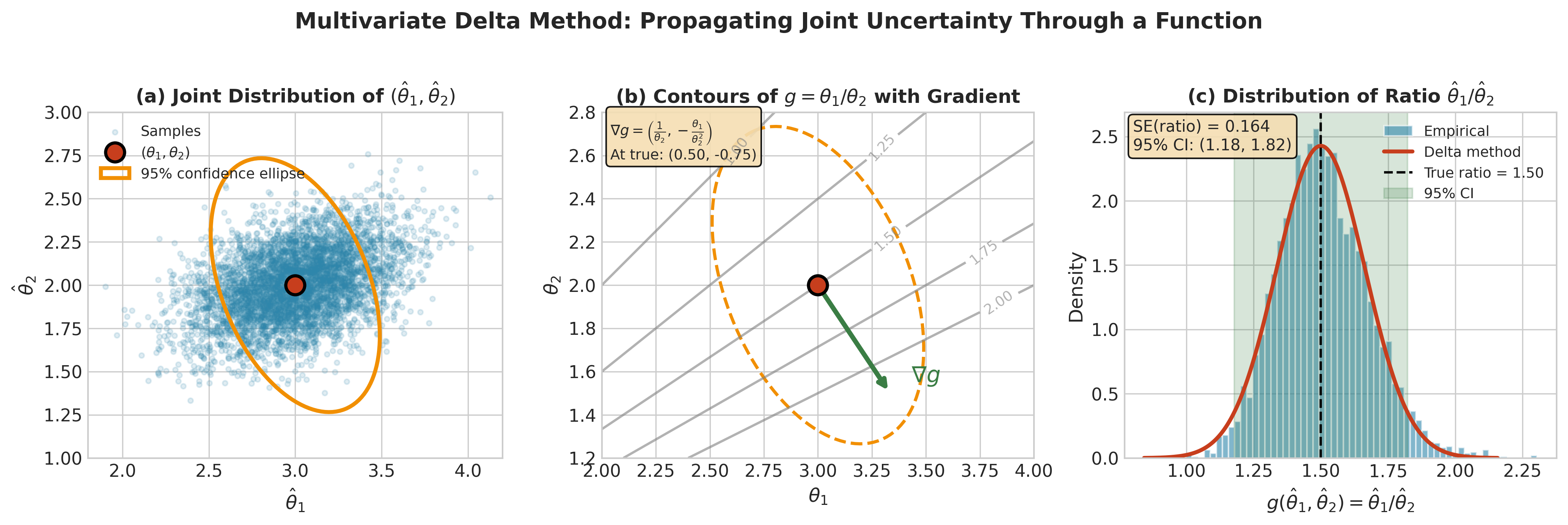 This section develops the theoretical foundations for quantifying estimator uncertainty. We begin with the fundamental concepts: what makes an estimator good (bias, variance, consistency), and how estimators behave across hypothetical repeated samples (sampling distributions). We then develop the delta method, which propagates uncertainty through transformations—essential when the scientifically relevant quantity is a nonlinear function of directly estimable parameters. Finally, we survey methods for estimating variance from data: Fisher information, observed information, and robust sandwich estimators that remain valid even when model assumptions fail.