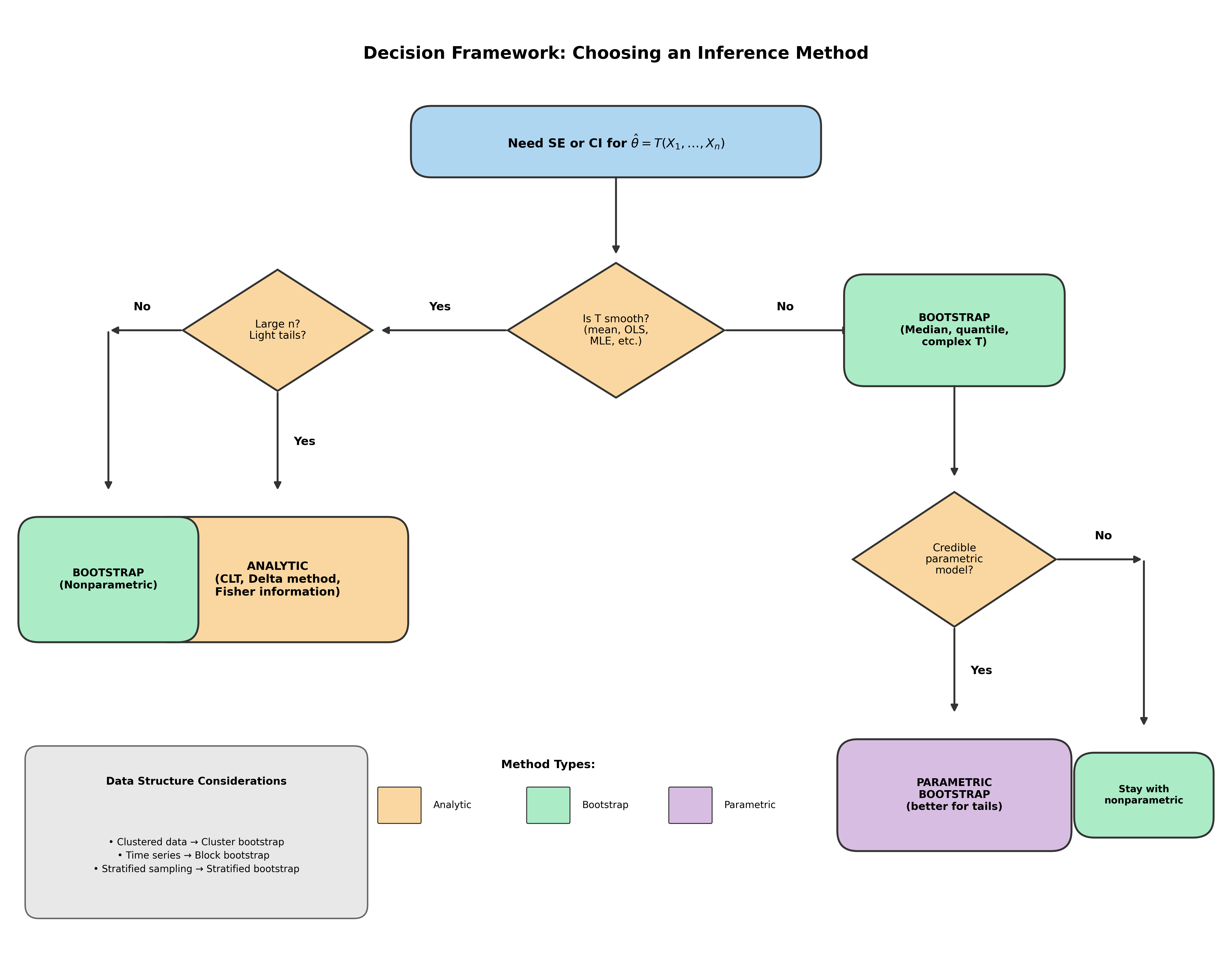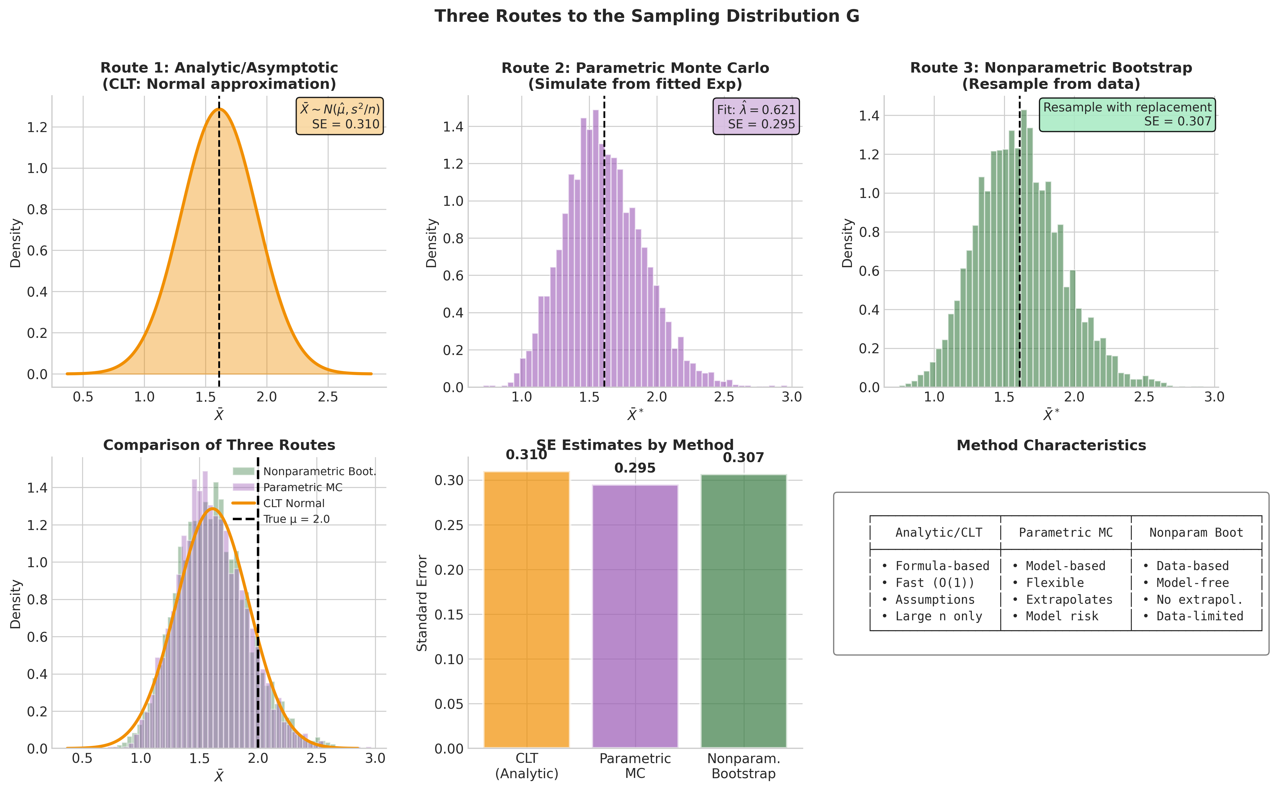 Three routes: Analytic methods derive \(G\) from theory (fast but assumption-heavy); parametric Monte Carlo simulates from a fitted model (flexible but model-dependent); bootstrap simulates from \(\hat{F}_n\) (model-free but data-limited).