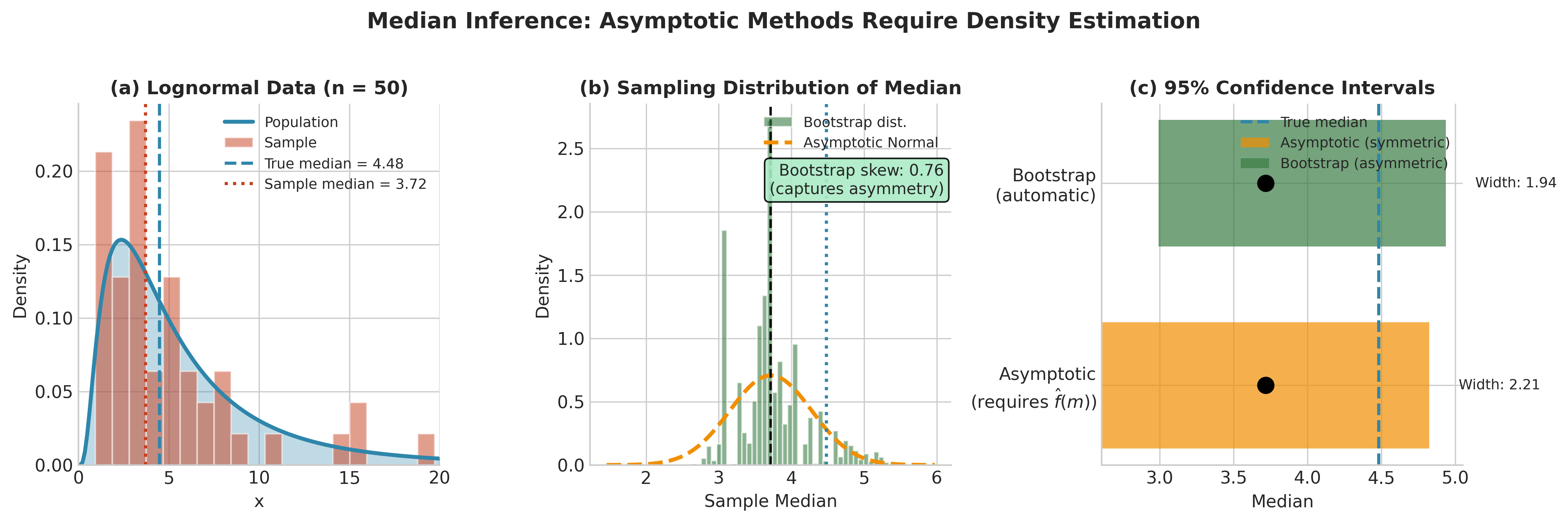 Part (b): Nonparametric Bootstrap — Median is non-smooth; asymptotic SE requires density estimation; bootstrap avoids this.