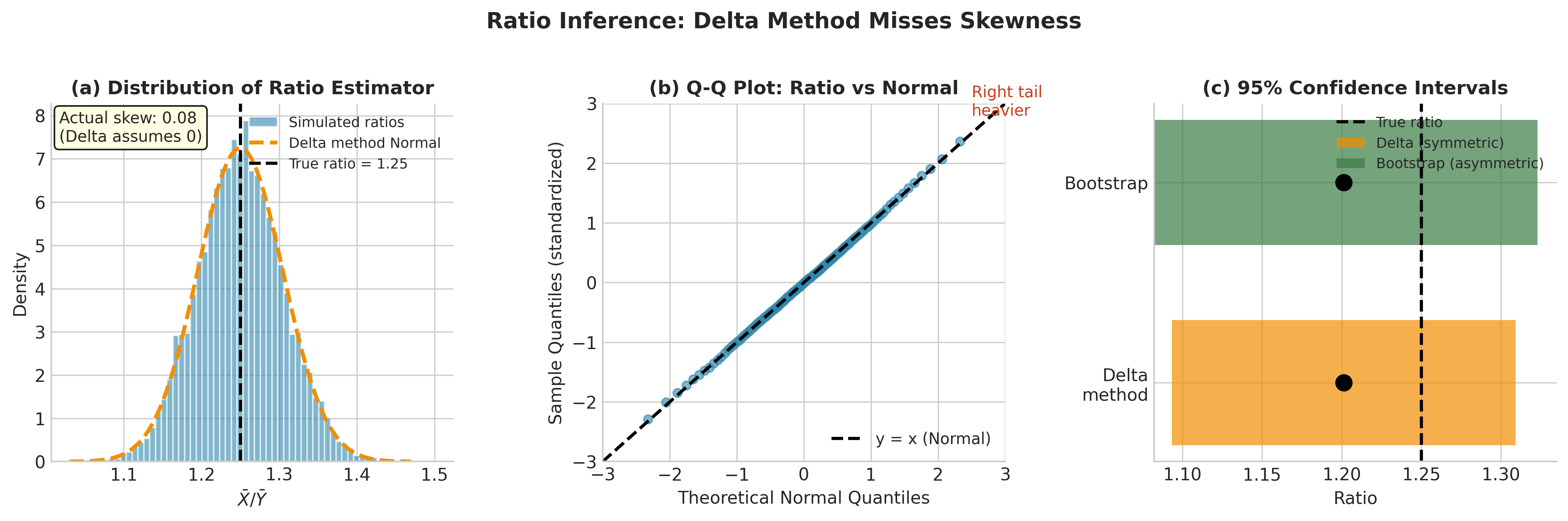 Part (c): Nonparametric Bootstrap — Ratios have skewed, non-normal distributions; delta method may be poor.