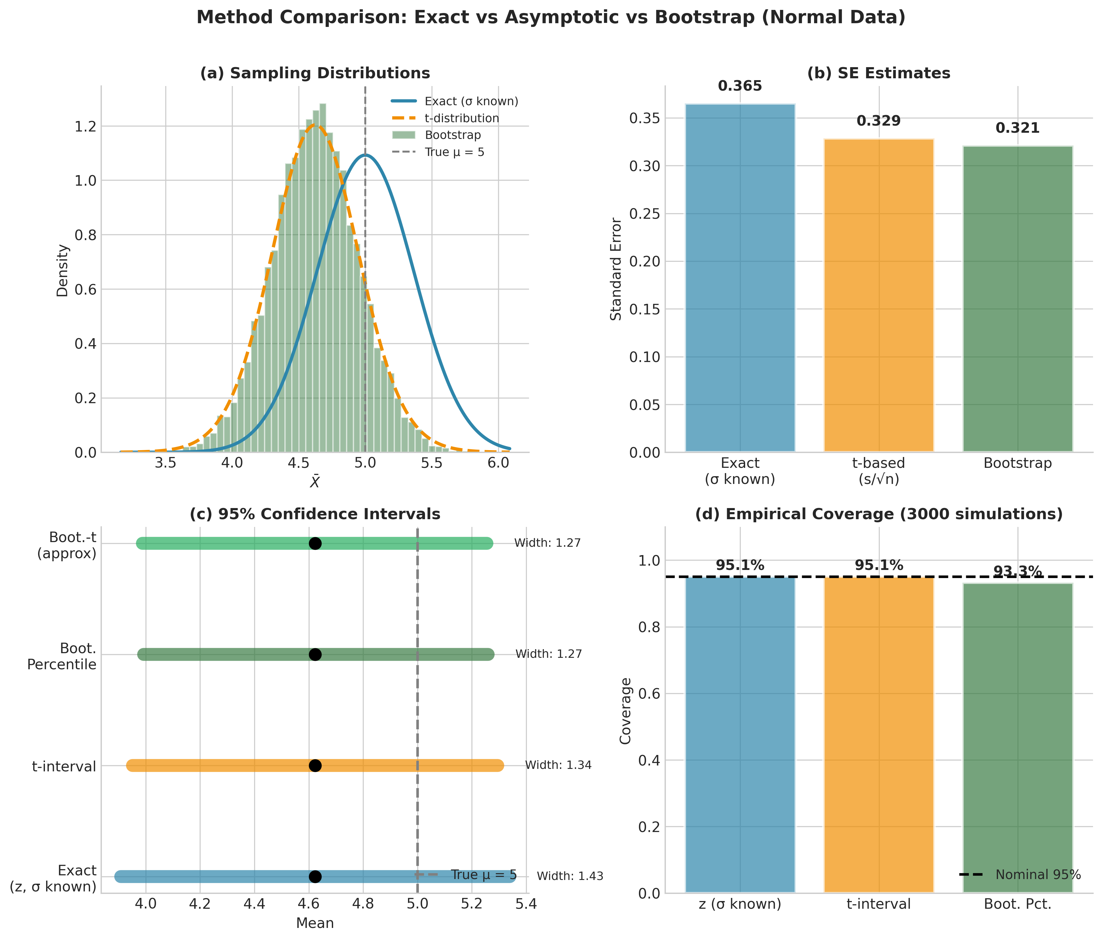 Results: Exponential and t(3) undercover for small \(n\) (below 92-93%). Normal achieves ~95% for all \(n\). Both methods perform similarly for the mean—bootstrap advantages emerge for non-smooth statistics.