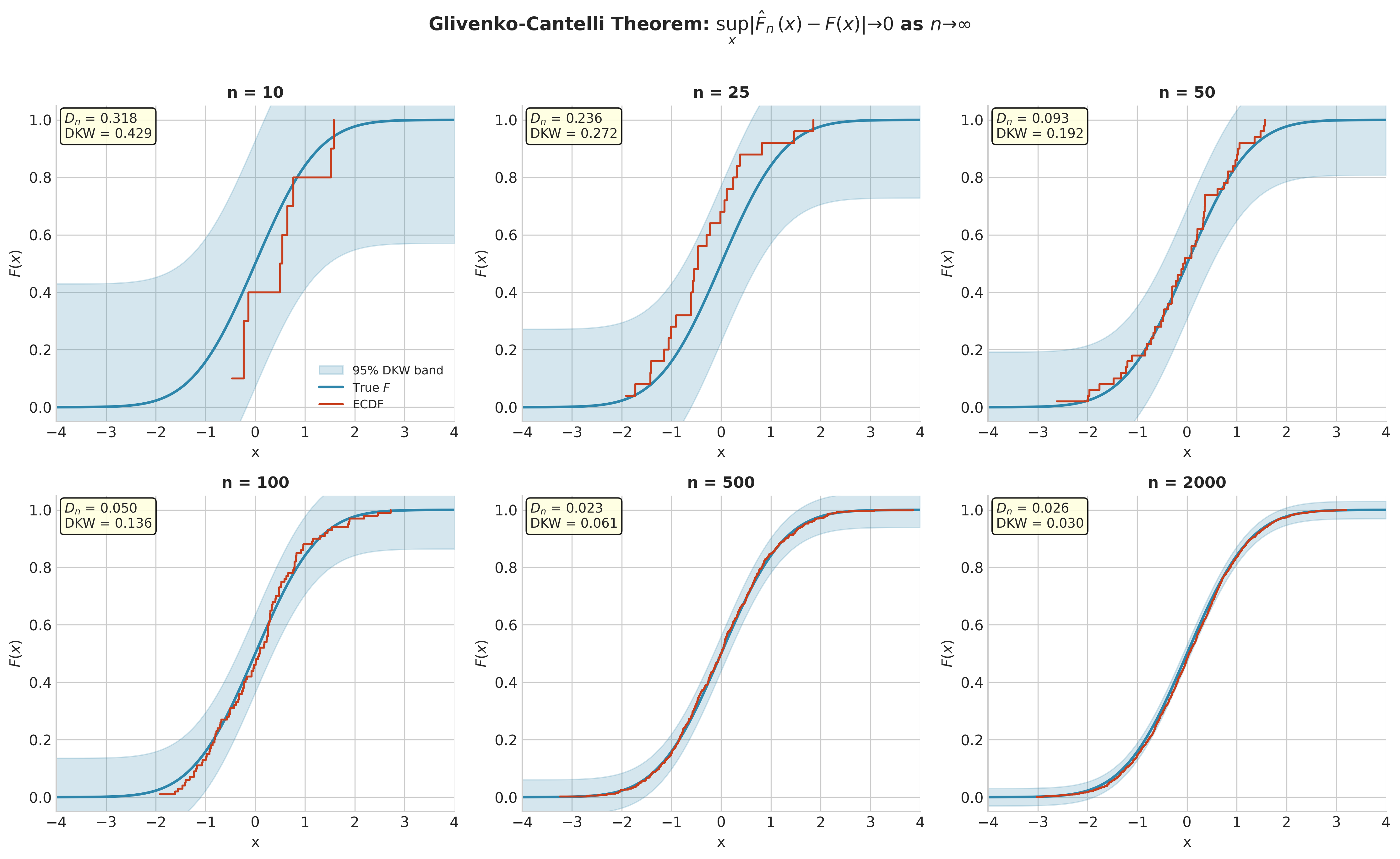 This section develops these foundations rigorously. We begin with the precise definition of the empirical CDF \(\hat{F}_n\) and establish its interpretation as a discrete probability distribution. We then prove two fundamental convergence theorems—pointwise convergence via the Strong Law of Large Numbers and uniform convergence via the Glivenko-Cantelli theorem—providing self-contained proofs at the level appropriate for this course. The Dvoretzky-Kiefer-Wolfowitz (DKW) inequality gives us finite-sample probability bounds that translate directly into confidence bands for \(F\). With these tools in hand, we formalize the plug-in principle: viewing parameters as functionals \(\theta = T(F)\) and estimating them by \(\hat{\theta} = T(\hat{F}_n)\). Finally, we examine cases where the plug-in approach fails, preparing for the more sophisticated methods in later sections.