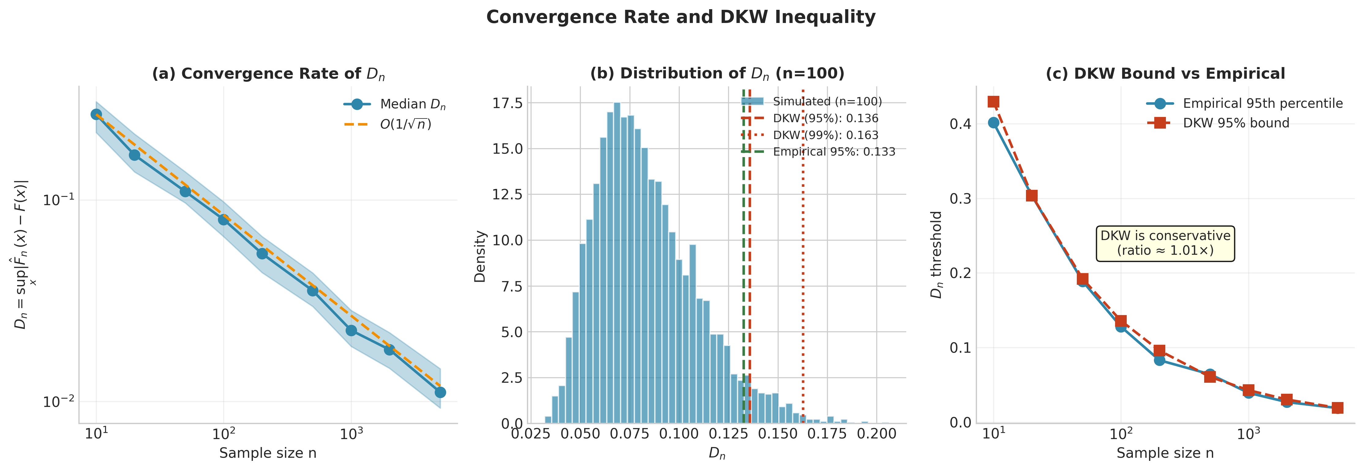 Massart, P. (1990). The tight constant in the Dvoretzky-Kiefer-Wolfowitz inequality. Annals of Probability, 18(3), 1269–1283. Proved that the constant 2 in the DKW inequality is tight, resolving a longstanding conjecture.