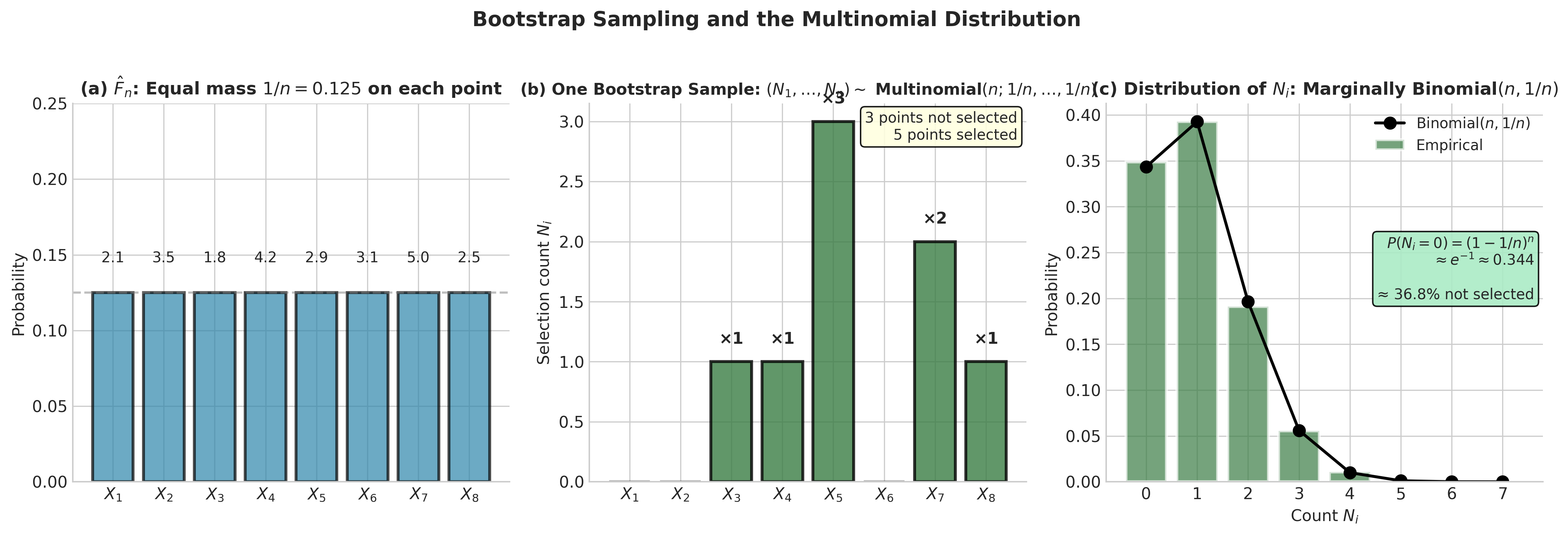 The bootstrap sampling process has a direct connection to the multinomial distribution. If we draw a bootstrap sample of size \(n\) from \(\hat{F}_n\), let \(N_i\) denote the number of times observation \(X_i\) appears in the bootstrap sample. Then: