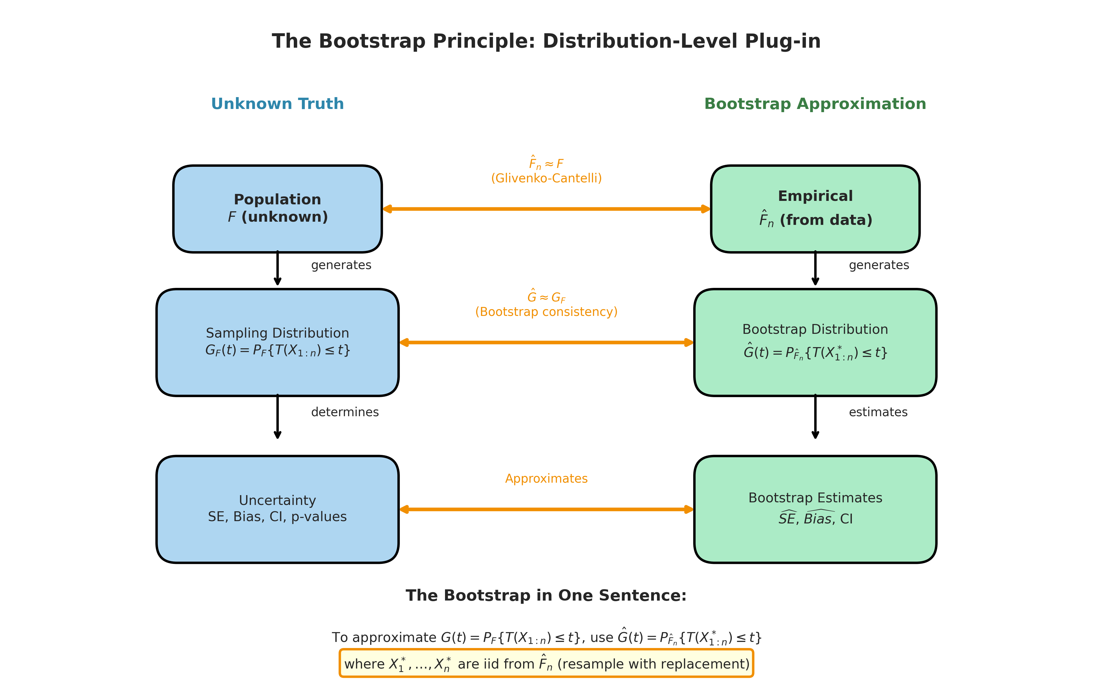 In Section 4.1, we identified the sampling distribution \(G\) as the fundamental target of statistical inference—everything we want to know about uncertainty flows from \(G\). We also introduced three routes to approximating \(G\): analytic derivation, parametric Monte Carlo, and the bootstrap. The bootstrap route is based on a deceptively simple idea: replace the unknown population distribution \(F\) with the empirical distribution \(\hat{F}_n\) computed from our observed sample.