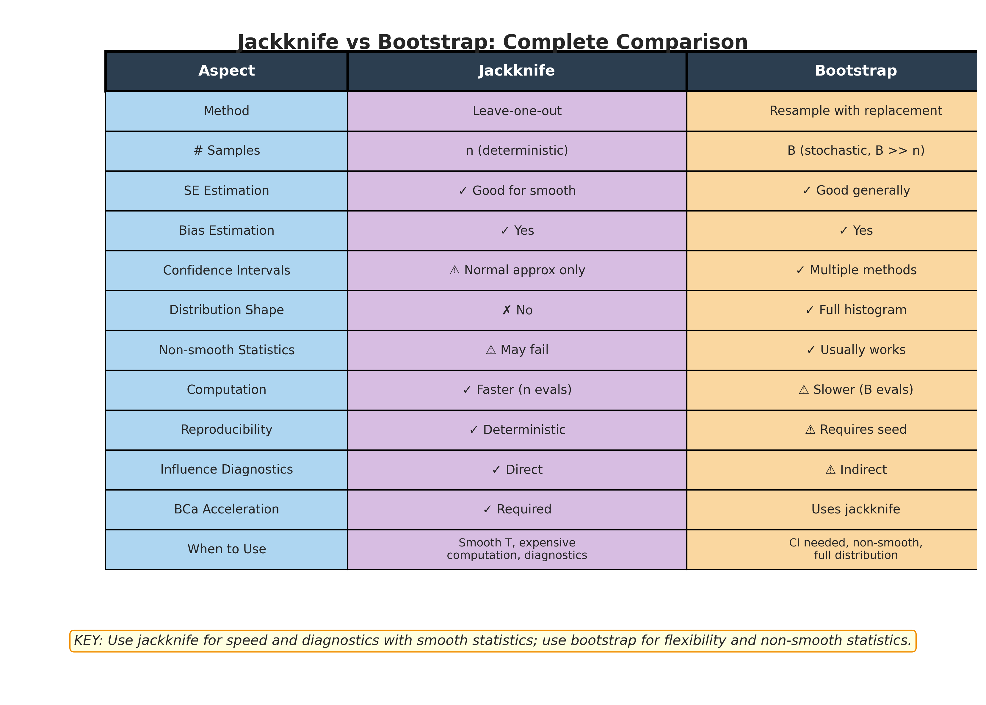 This section develops the jackknife as both a historical precursor to the bootstrap and a modern tool with distinct strengths. We begin with the delete-1 jackknife, extend to the delete-\(d\) generalization, explore bias correction, and conclude with a systematic comparison to bootstrap methods. Throughout, we emphasize when each method excels and how they can be used together.