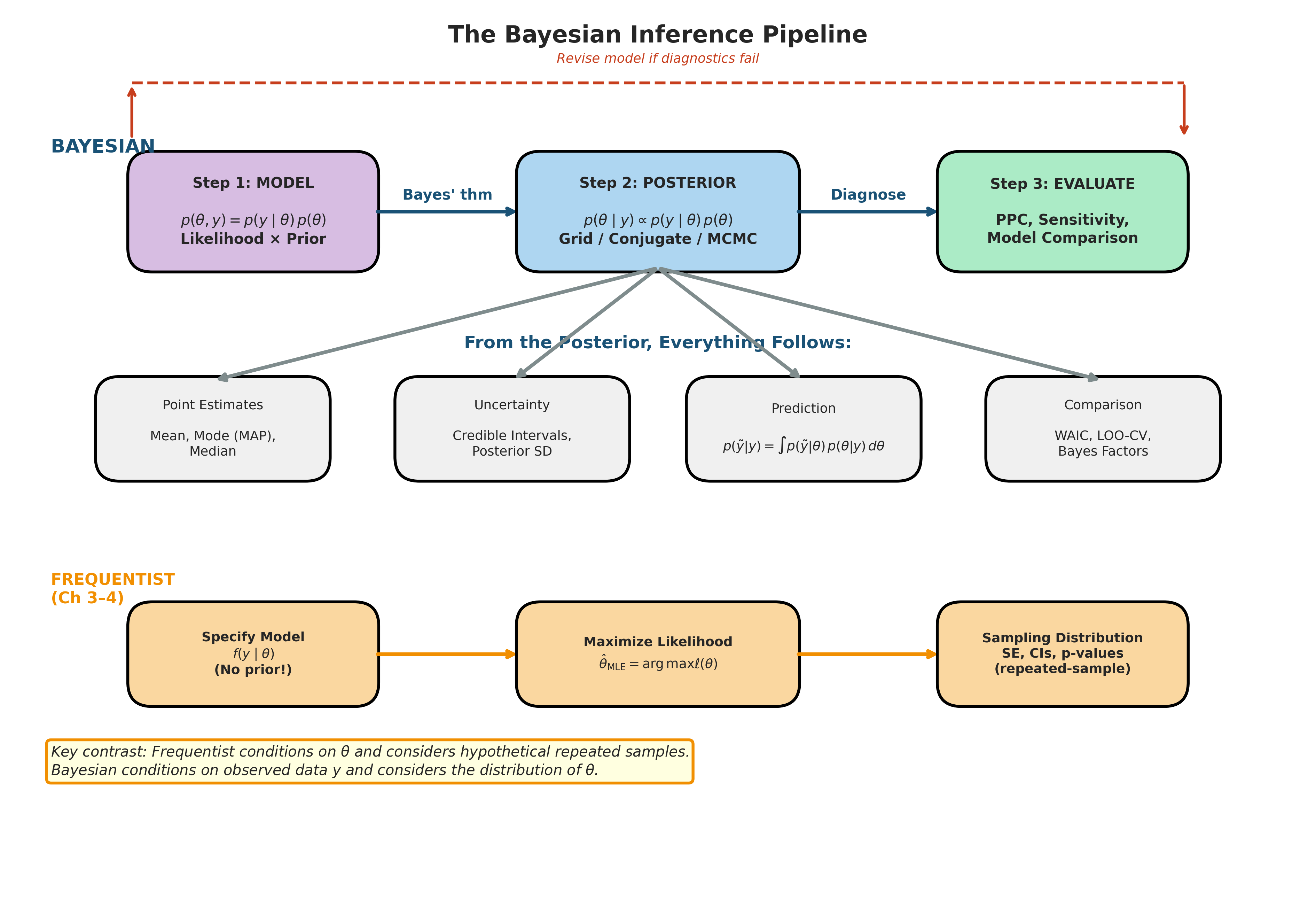 Understand: The three-step Bayesian workflow (model specification → posterior computation → model evaluation) and how it contrasts with the frequentist pipeline from Chapter 3