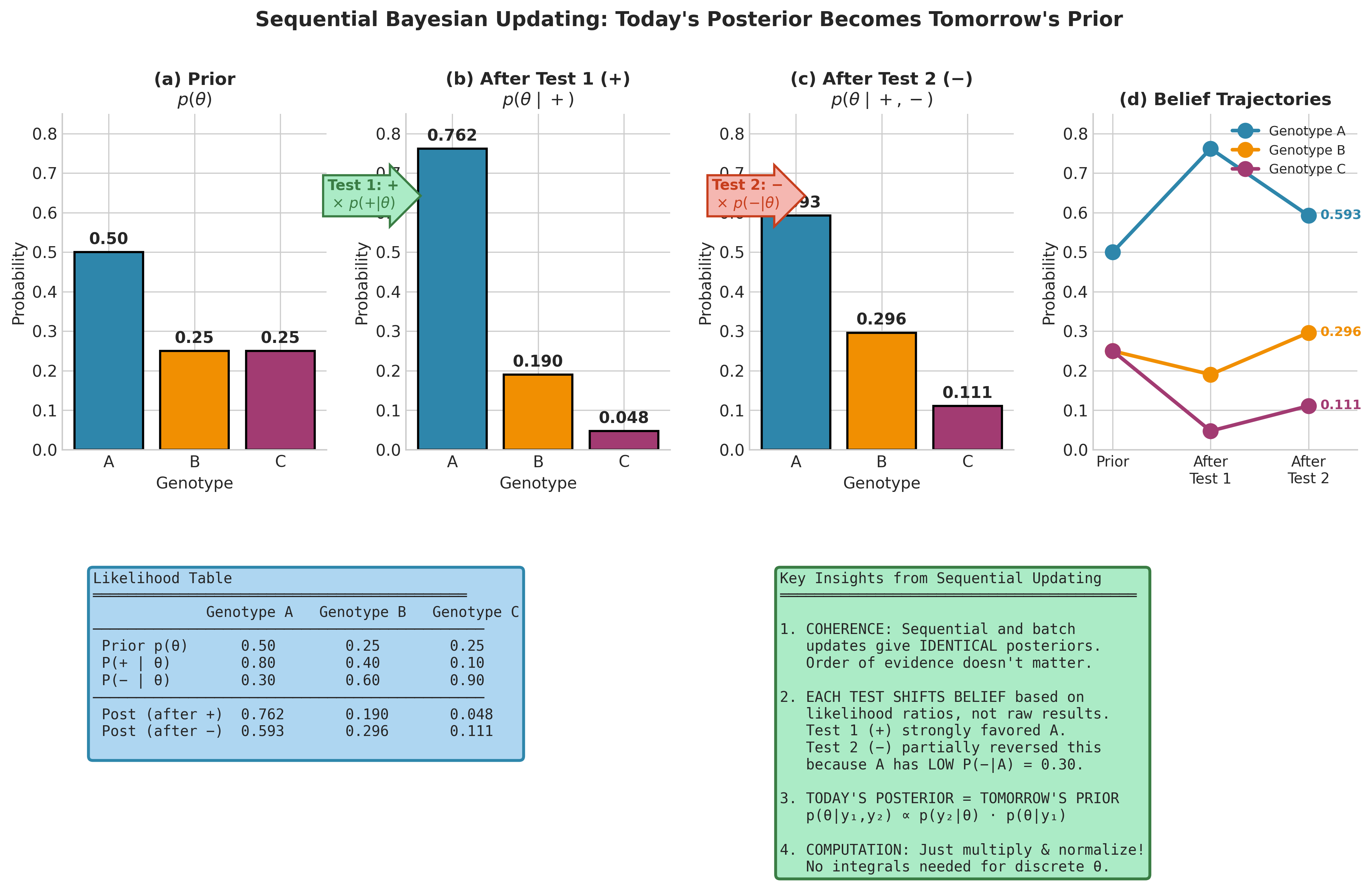 Beginners often treat Step 1 as unimportant — picking priors casually and focusing only on computation. In practice, model specification is the most consequential step. We address prior specification systematically in Section 5.2 Prior Specification and Conjugate Analysis, but even at this early stage, the principle is clear: every assumption in a Bayesian model is explicit and auditable. This transparency is simultaneously a strength (assumptions can be examined, criticized, and revised) and a responsibility (sloppy assumptions cannot hide behind mathematical formalism).