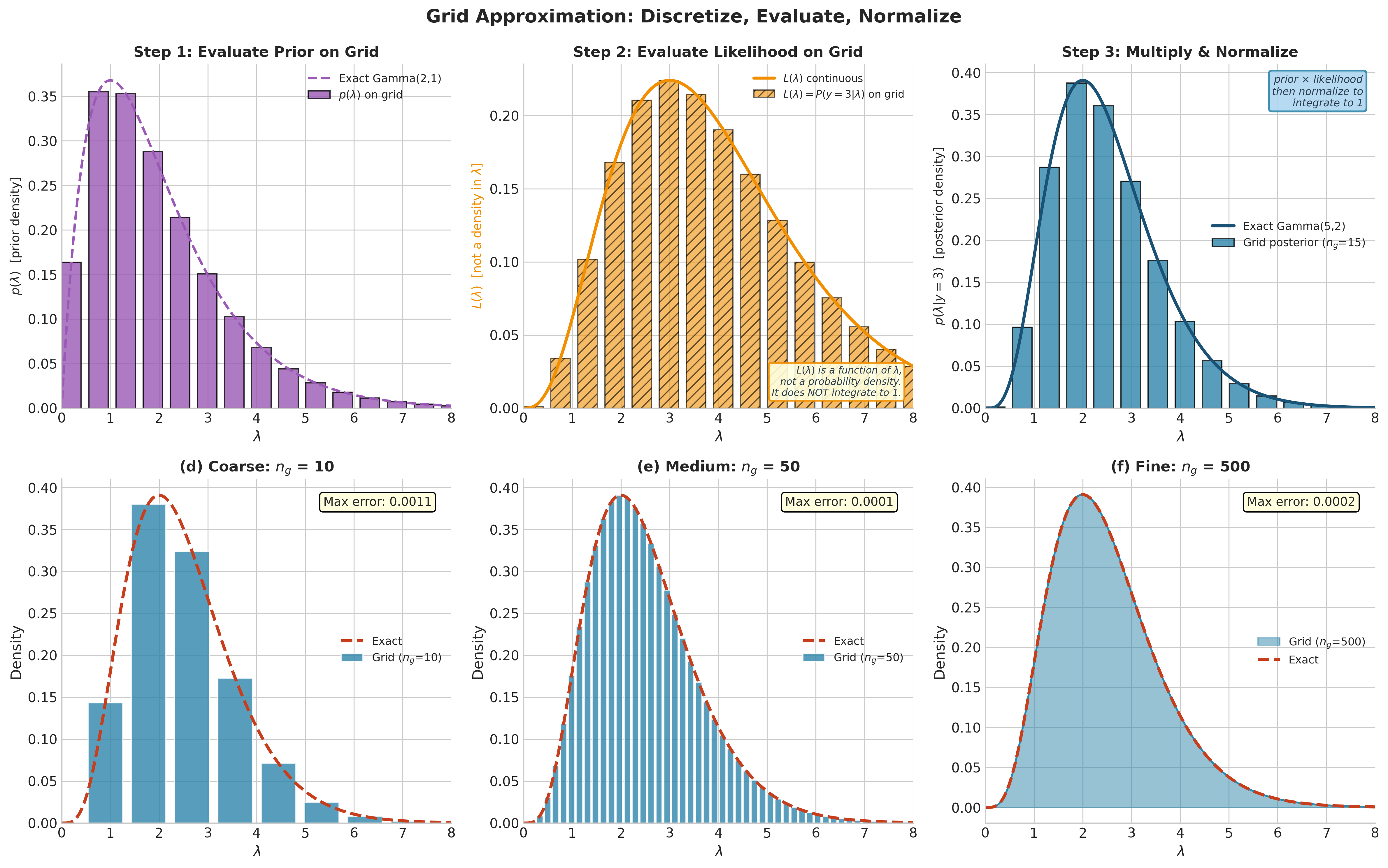 Part (c): Without log-scale, prior * likelihood underflows to 0.0 for all grid points once \(n \gtrsim 20\), because \(e^{-\lambda \cdot n\bar{x}}\) is astronomically small for most \(\lambda\) values.