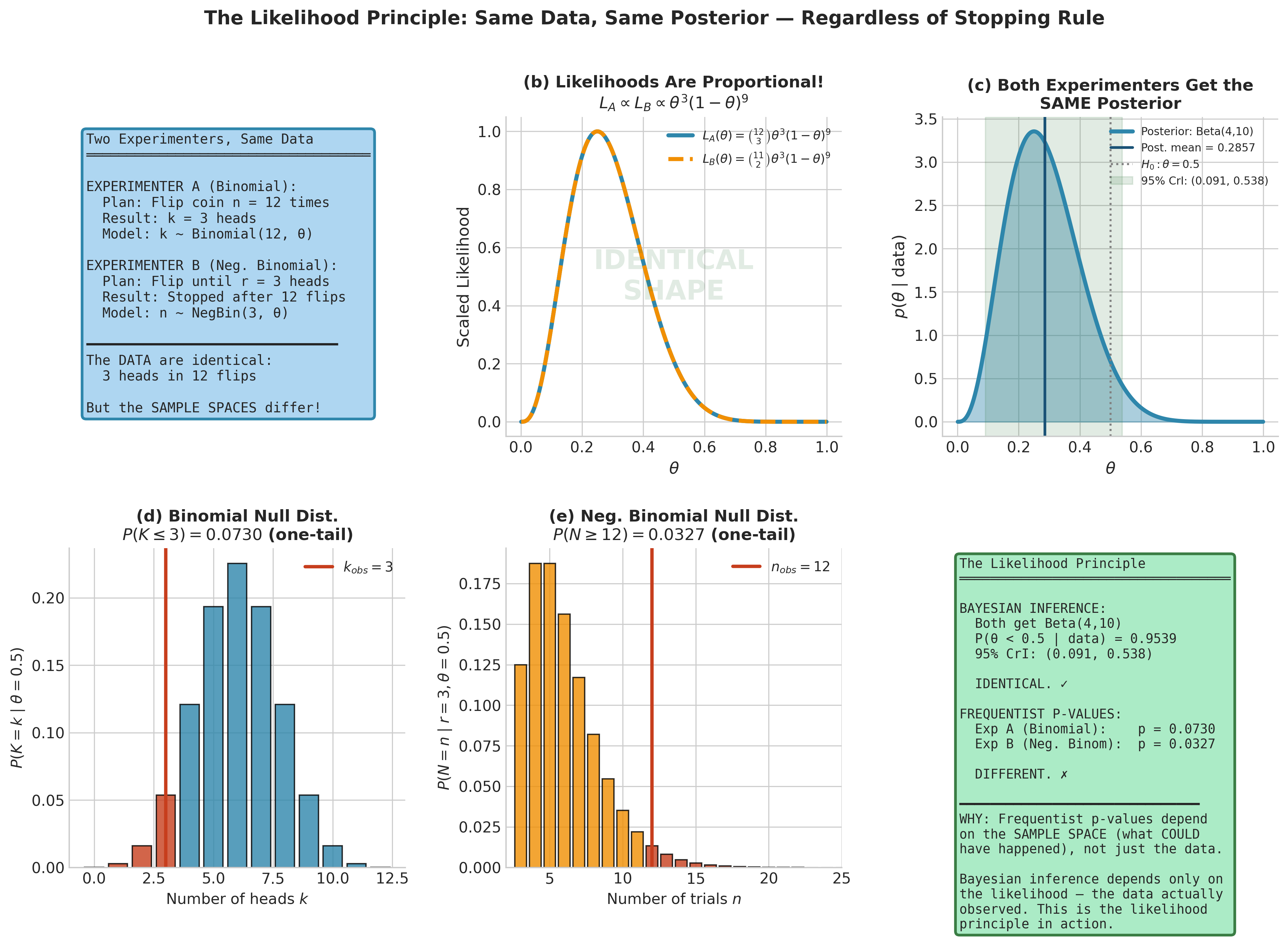 Verify the likelihood principle example from the text computationally: for \(k = 3\) heads in \(n = 12\) flips, compute the Binomial and Negative Binomial \(p\)-values for \(H_0: \theta = 0.5\) and confirm they differ, while the Bayesian posterior (under a Uniform prior) is identical.