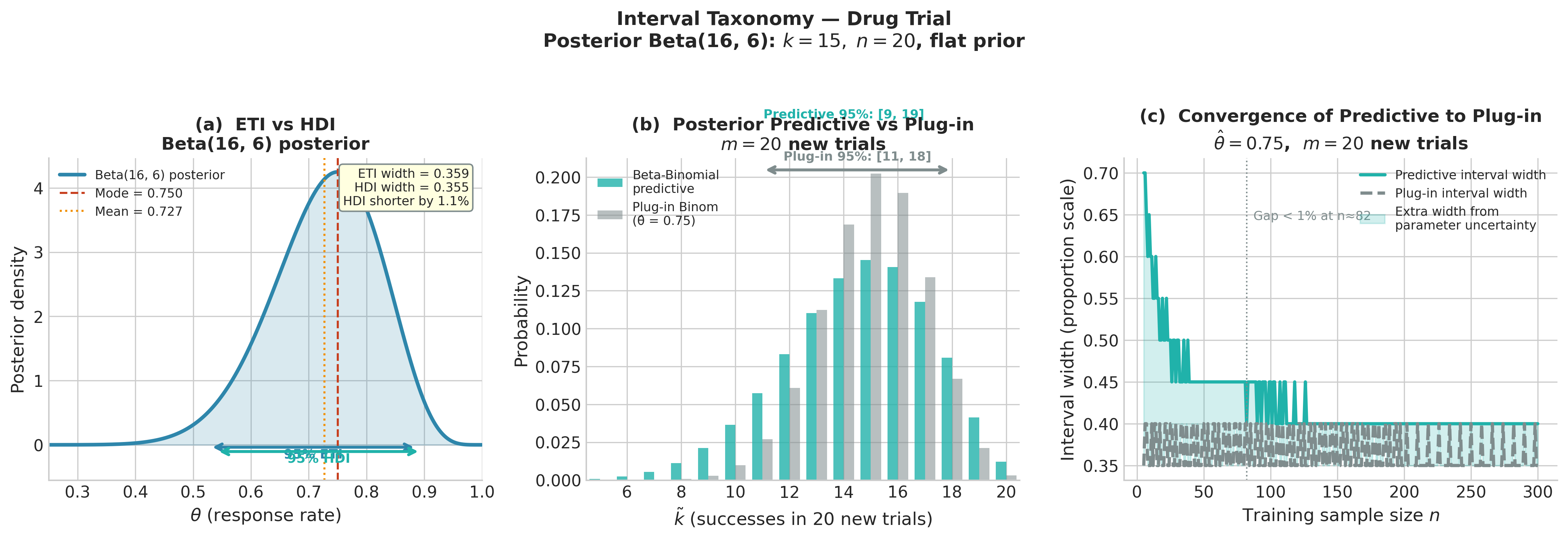 Predictive intervals: The posterior predictive interval, obtained by marginalizing \(p(\tilde{y} \mid \theta)\) over the posterior, is wider than the plug-in prediction interval because it propagates parameter uncertainty. As \(n \to \infty\), the posterior concentrates on the MLE and the two intervals converge — but for finite samples the Bayesian predictive is more honest about total uncertainty. [LO 4]