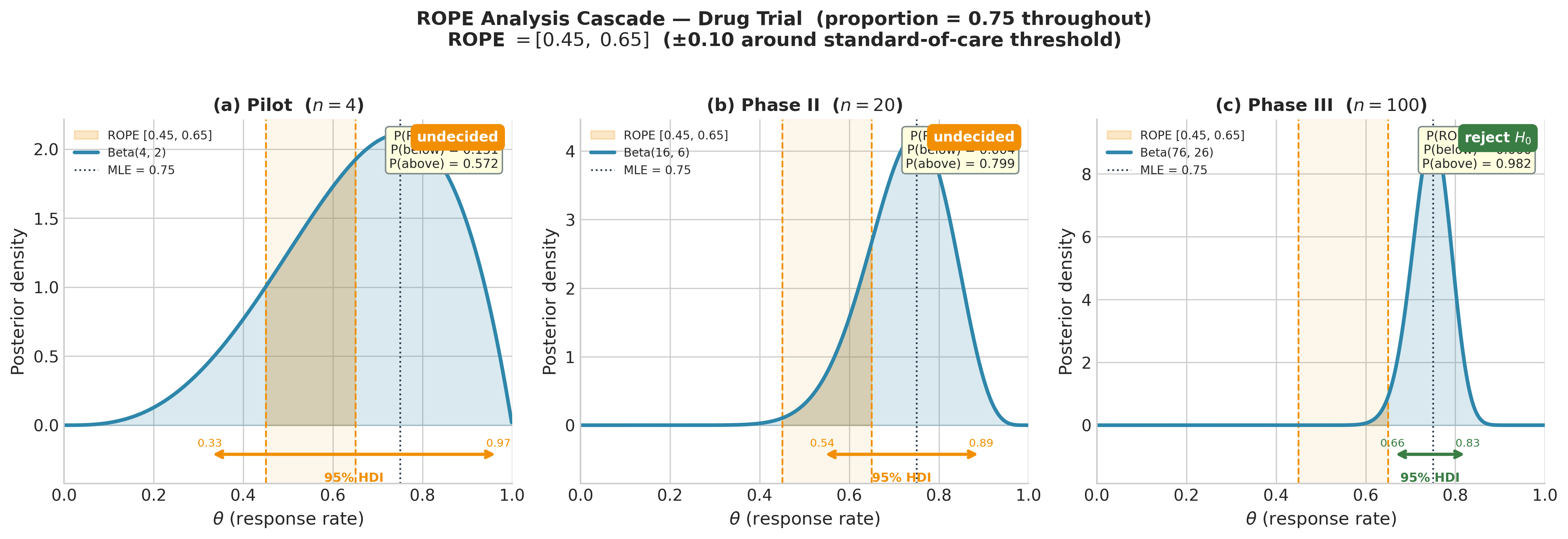 Directional probability: \(P(\theta > \theta_0 \mid y) = 1 - F_{\text{post}}(\theta_0)\) is computable directly from the posterior CDF and directly answers directional scientific claims without constructing a sampling distribution under a null hypothesis. The ROPE framework extends this to practical equivalence testing by comparing the HDI to a “null region” rather than a null point. [LO 2, 4]