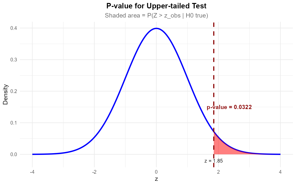 We translate the general description of \(p\)-values to a mathematical expression for an upper-tailed hypothesis test: