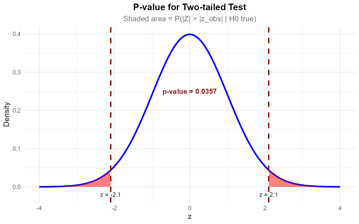 In a two-tailed hypothesis test, we must consider the “unusual” deviations on both sides. Therefore, we compute the area corresponding to larger absolute deviations from \(\mu_0\) than the currently observed \(|\bar{x}-\mu_0|\):