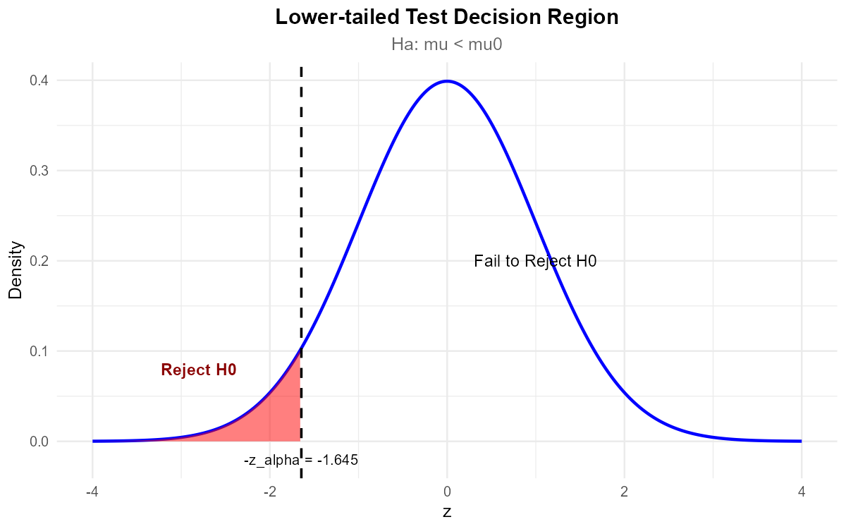 Formally, the null hypothesis is rejected if the observed sample mean falls below the lower \(\alpha \cdot 100\)-th percentile of the null distribution, or if \(\bar{x} < -z_\alpha\frac{\sigma}{\sqrt{n}} + \mu_0\). Standardizing both sides, rejection occurs when: