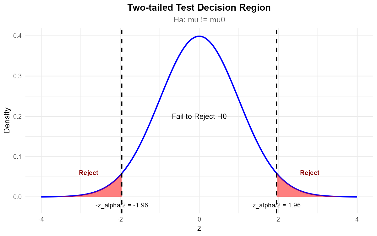 we are starting off with the belief that the true mean is equal to \(\mu_0\). Thus, an extreme deviation on either side should lead to its rejection. We set two cutoffs—upper and lower—around \(\mu_0\) and reject the null if the sample mean falls outside this range by being either too small or too large.