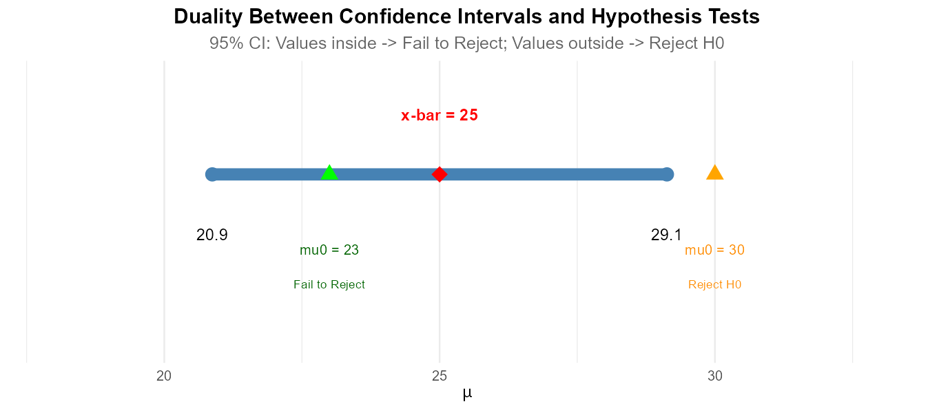 Since p-value = \(0.0455 < \alpha = 0.05\), we reject the null hypothesis. Both approaches give the same conclusion. This confirms the duality relationship.