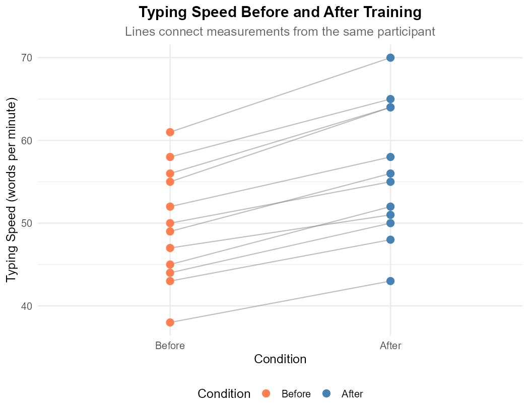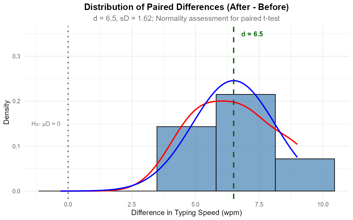 The parameter of interest is \(\mu_D\), the mean difference between paired observations. Critically, we must explicitly define how the difference is calculated, as this determines the direction of our alternative hypothesis.