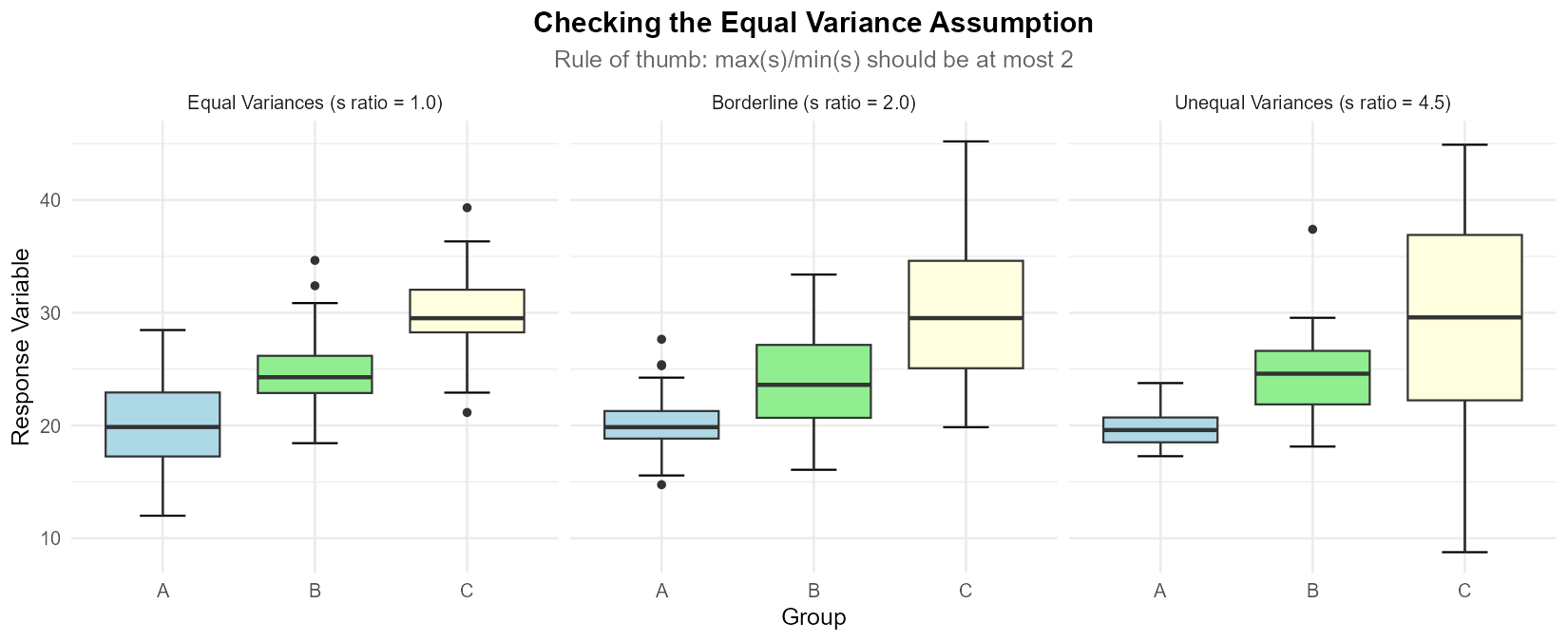 True — We check max(s)/min(s) ≤ 2 using sample standard deviations. If the ratio is at most 2, the equal variance assumption is considered reasonable.