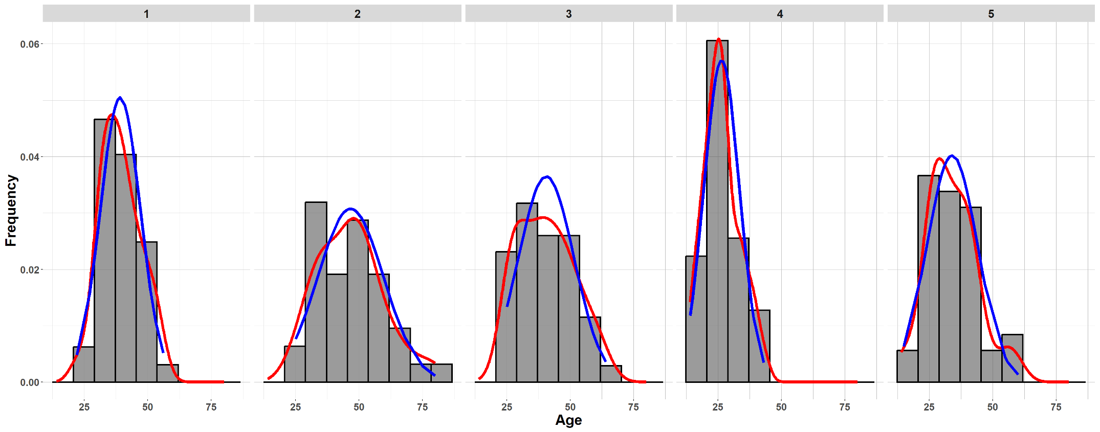 Fig. 12.3 Group-wise histograms for the coffeehouse example