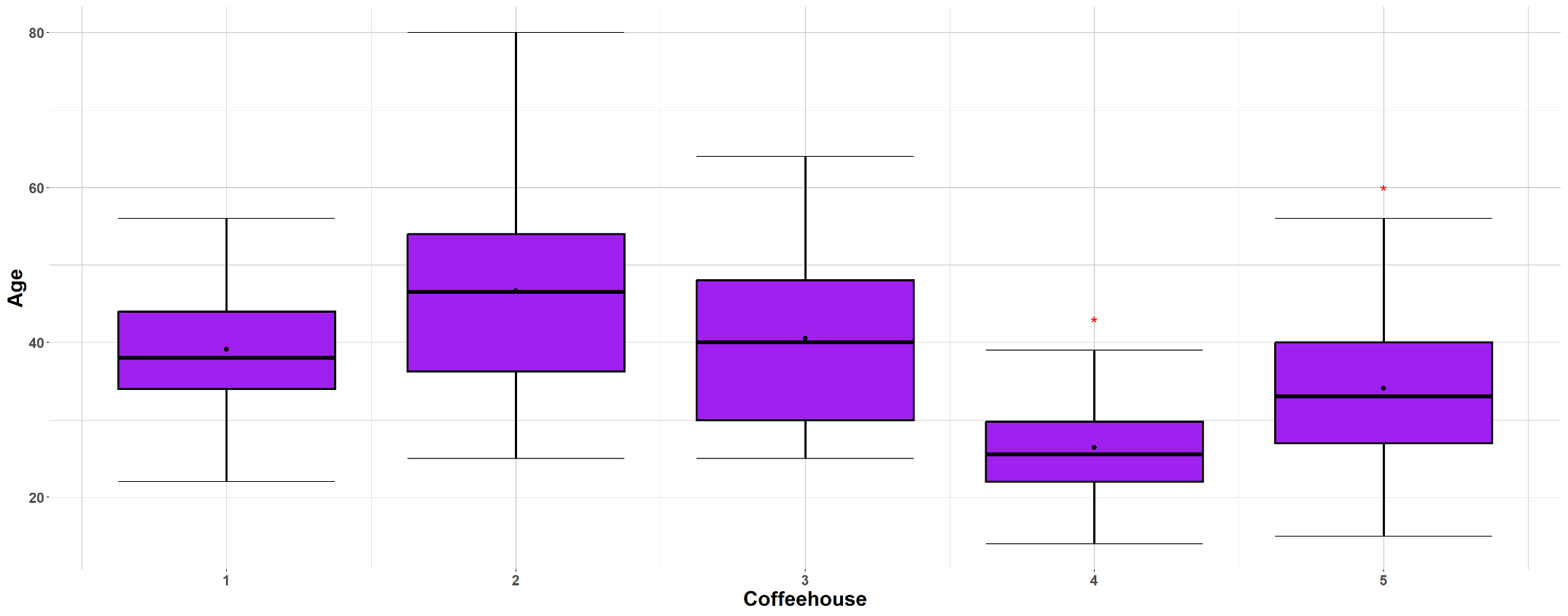 From the boxplots, we observe that the customer age sample from Coffeehous 4 spans a notably lower region than others. Its difference with Coffeehouse 2 is most evident—the mean age at Coffeehouse 2 appears higher than even the maximum observed at Coffeehouse 4. Other coffeehouses show larger overlaps.
