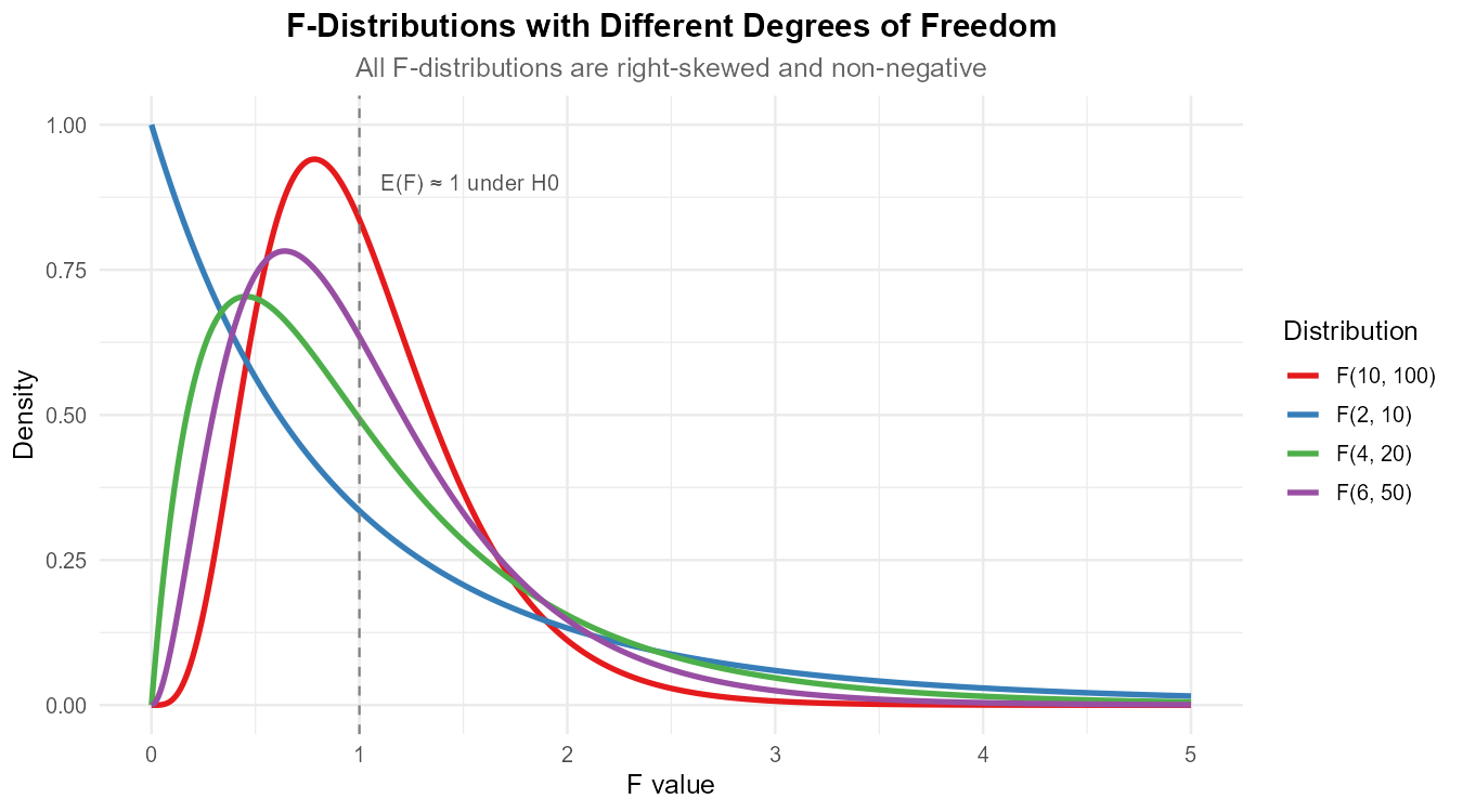 When \(H_0\) is true, both MSA and MSE estimate \(\sigma^2\), so their observed ratio tends to be close to 1. When \(H_0\) is false, however, MSA estimates something larger, making it more likely for the ratio to take a value significantly larger than 1.
