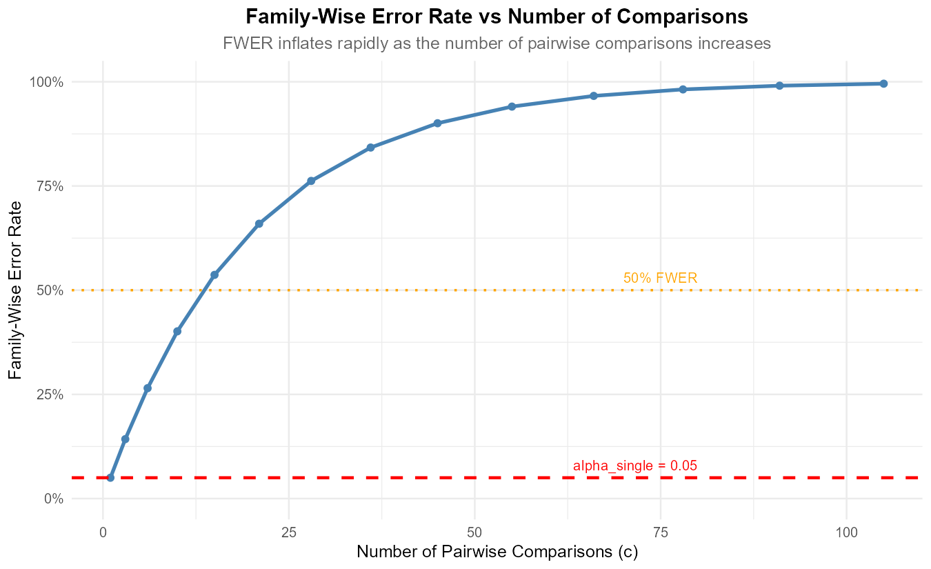 When performing multiple simultaneous inferences, we are concerned not only with controlling the individual Type I error probability \(\alpha_{\text{single}}\), for each test, but also with managing the Family-Wise Error Rate (FEWR), \(\alpha_{\text{overall}}\). The FWER is essentially the probability of making at least one individual Type I error.