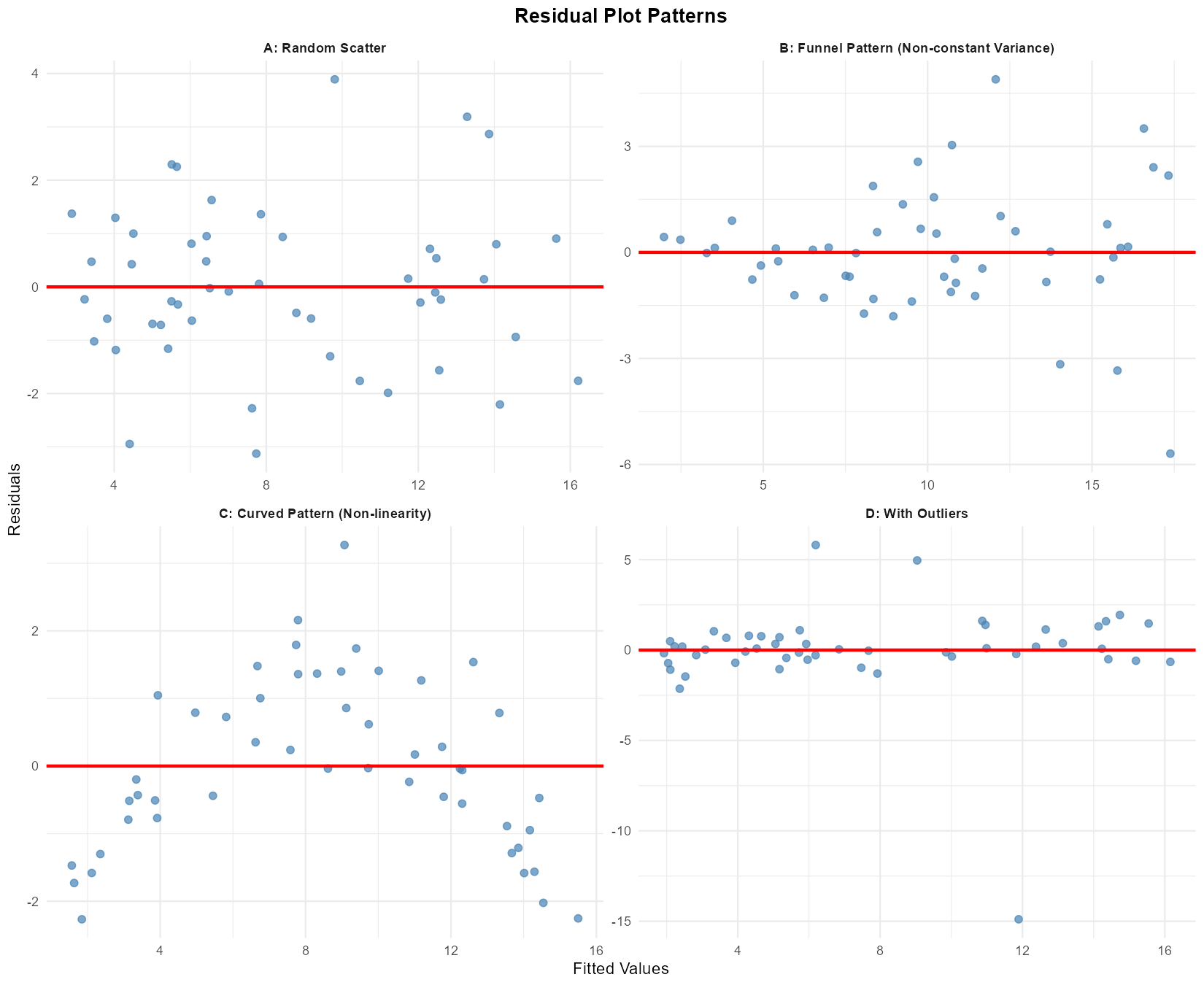 If residuals systematically fall below the zero line in certain regions of \(x\) values and above the line in others, this suggests the true relationship is non-linear.