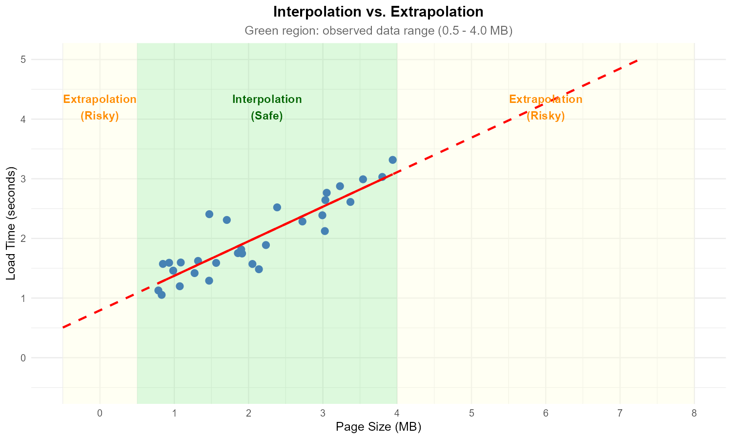 One of the most important applications of linear regression is prediction—using the fitted model to estimate the response for a new explanatory input \(x^*\). However, a fitted model is reliable for prediction only if the explanatory value is “reasonable” for the model. To understand what counts as reasonable, we should first understand the difference between interpolation and extrapolation.