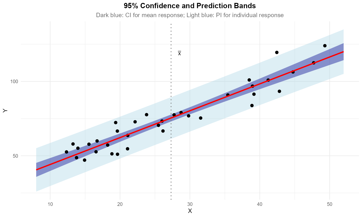 Outer bands (lighter/wider): Prediction bands for individual observations