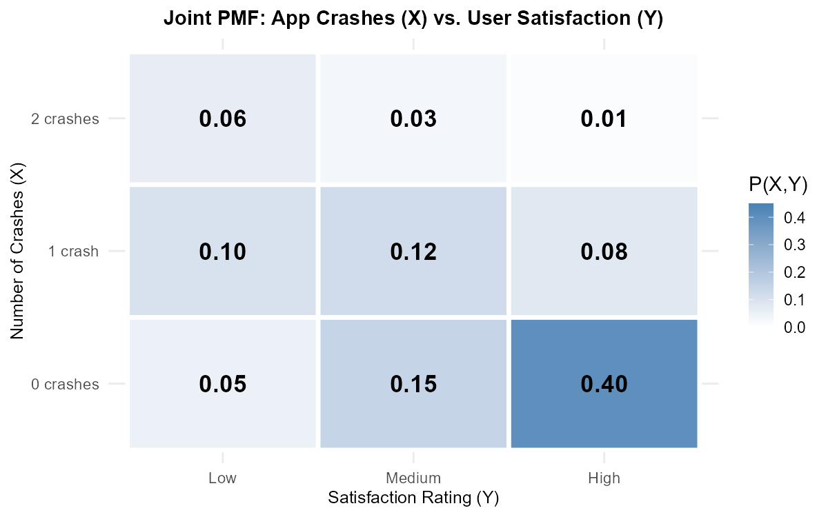 For two discrete random variables with finite supports, we can represent the joint PMF as a table. Each cell contains the probability that \(X\) equals the row value and \(Y\) equals the column value.
