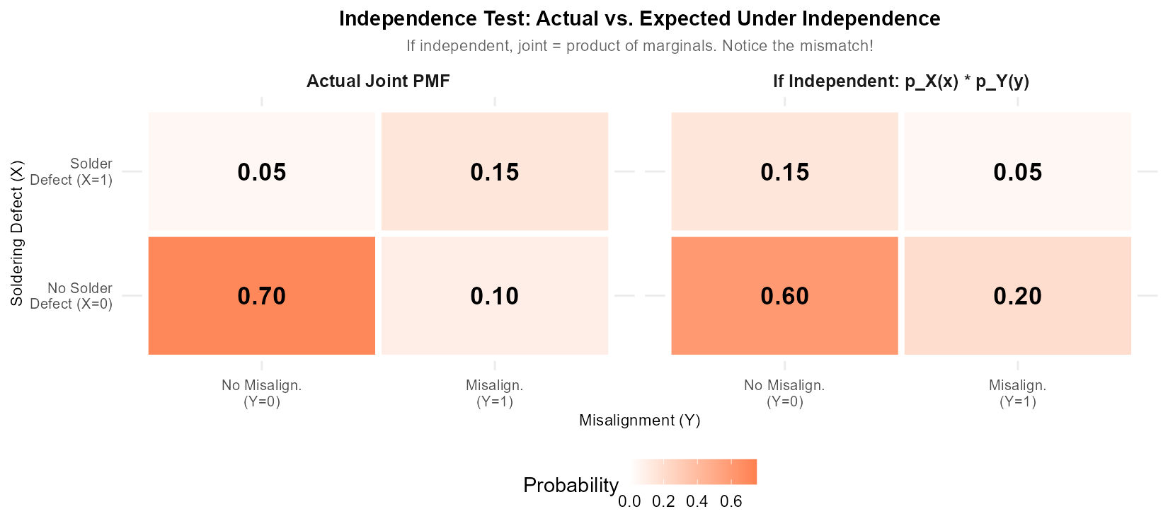 A joint distribution can encode constraints (a bounded sum in the previous example) that never appear in the marginals alone. Whenever the joint PMF doesn’t factor, dependence is at play.