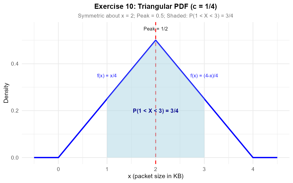 Peak at \(x = 2\) where \(f_X(2) = \frac{1}{4} \cdot 2 = \frac{1}{2}\)
