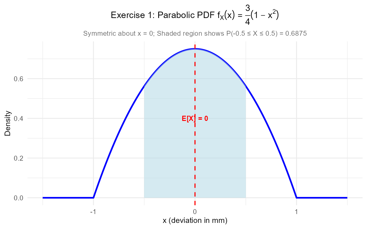 \[\begin{split}\int_{-\infty}^\infty f_X(x)dx &= \int_{-\infty}^{0.5} f_X(x)dx + \int_{0.5}^{1.5}f_X(x)dx + \int_{1.5}^{\infty} f_X(x)dx\\ &= 0 + \int_{0.5}^{1.5} 12(x-0.5)^2(1.5-x) dx + 0\\\end{split}\]Above, we first split the beginning intetral to a sum of integrals over three intervals. This step makes it evident that the integrals below \(0.5\) and above \(1.5\) are not just arbitrarily omitted from computation—they simply contribute zero area to the integral. Continuting,