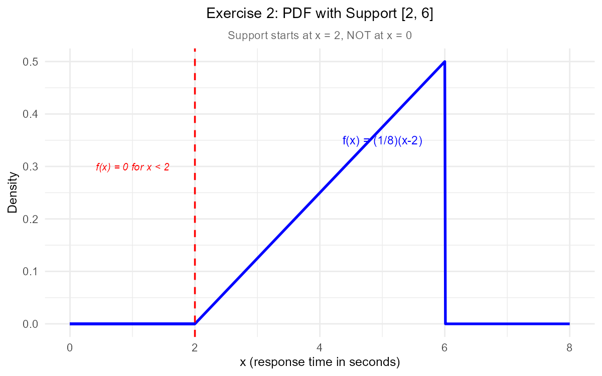 The PDF is \(f_X(x) = e^{-(x-2)}\) for \(x \geq 2\). This is a shifted exponential distribution.