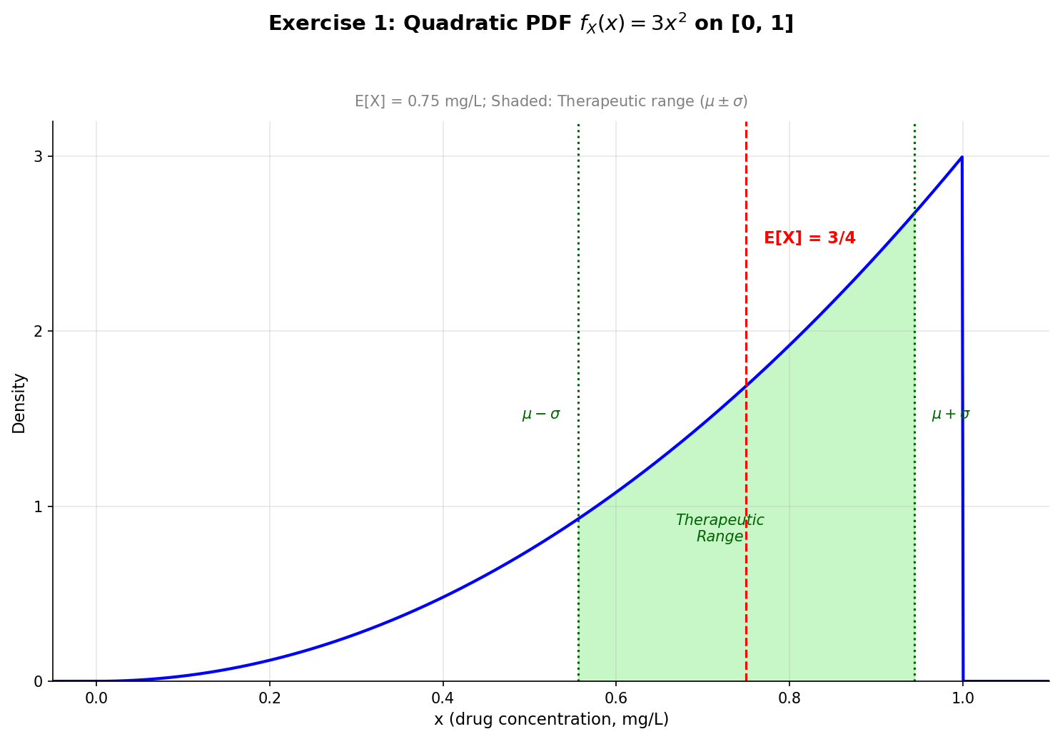 A biomedical engineer models the concentration \(X\) (in mg/L) of a drug in a patient’s bloodstream with the following PDF: