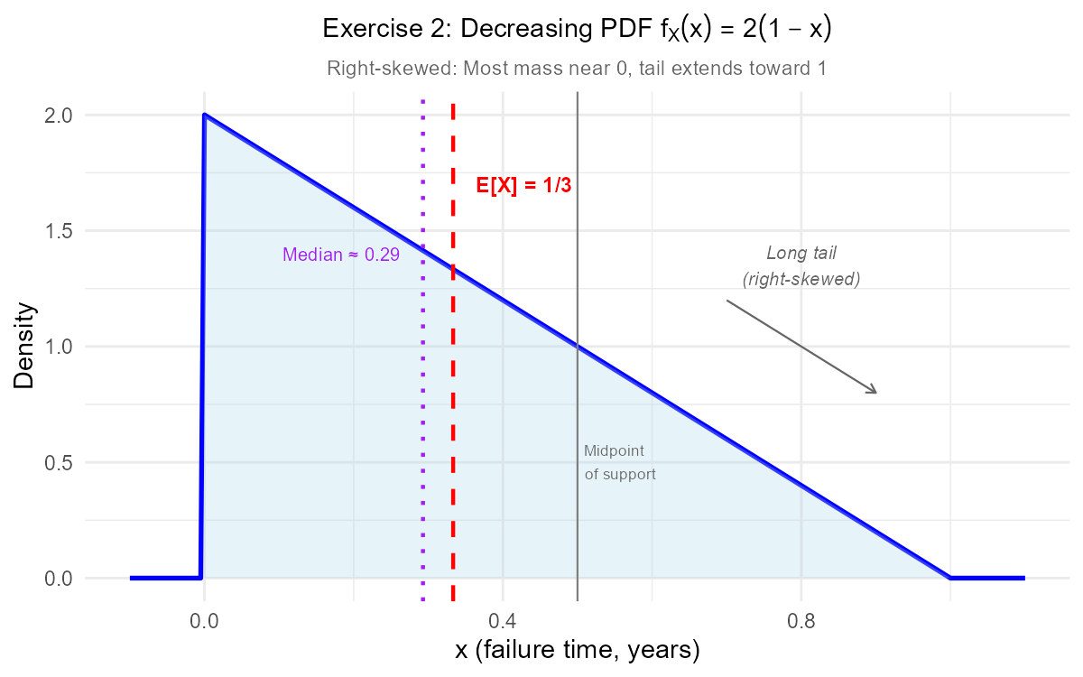 This integral represents the “balance point” or center of mass of the probability distribution. Just as in the discrete case, values with higher probability density contribute more to the overall average.