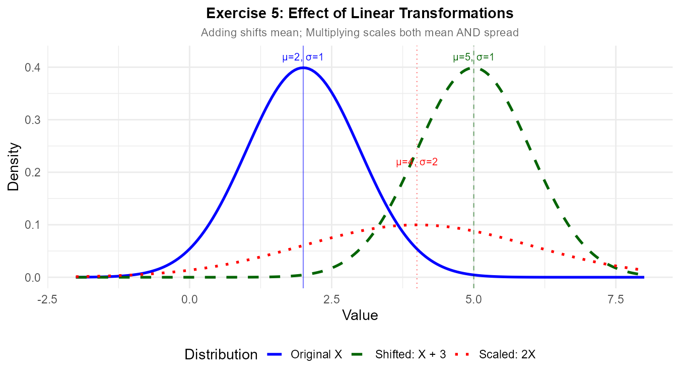 Adding a constant (\(b\)) doesn’t change how spread out a distribution is—it just shifts its location.