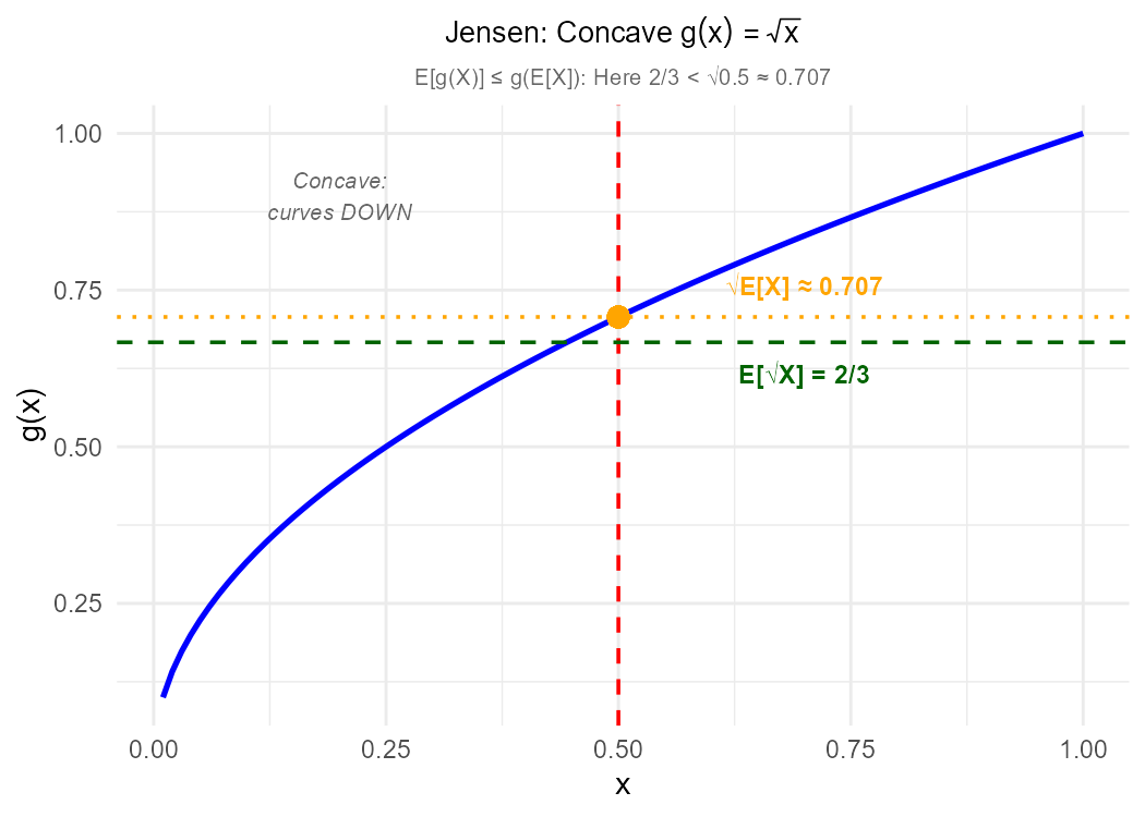 Explanation: The square root function \(g(x) = \sqrt{x}\) is concave (curves downward). For concave functions, we have: