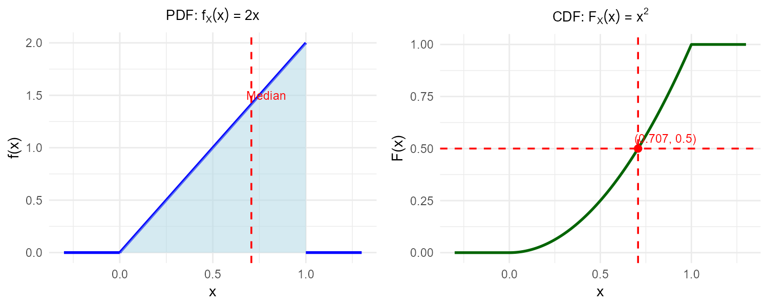 The median of a continuous random variable is the value \(x\) where \(F_X(x) = 0.5\).