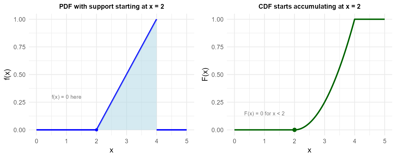 \[F_X(x) = \int_{-\infty}^x f_X(t) \, dt\]is an integral from negative infinity up to the input value, \(x\). Starting directly from this definition—without skipping steps—will help you become familiar with the subtle patterns involved in constructing piecewise CDFs.